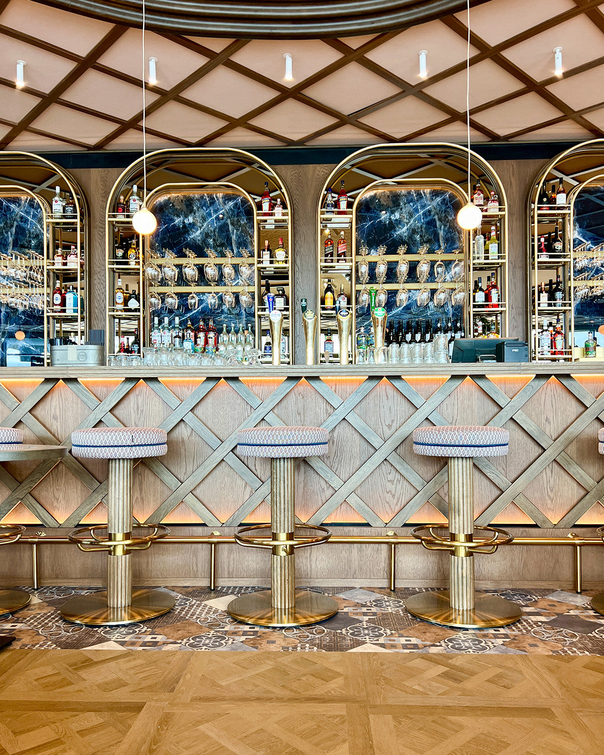 Carefully layered pendants and wall-mounted lighting provide soft, ambient illumination, highlighting key materials and defining intimate dining zones without overwhelming the space. The lighting adapts throughout the day, from bright and