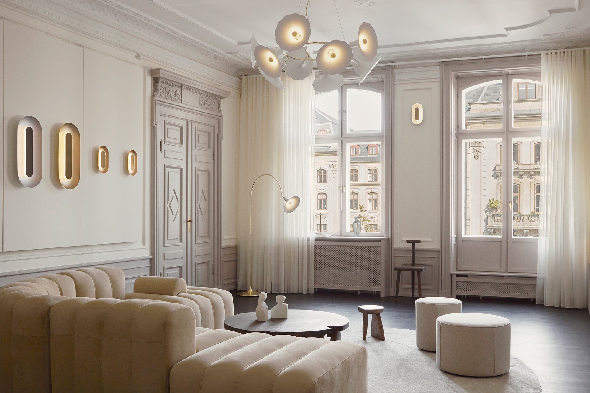 The spaces are illuminated by carefully chosen Nuura lamps, with warm and inviting light highlights the decorative, historical details of the building's architecture. This intentional lighting creates a sensory, holistic experience where aesthetics, functionality, and well-being come together.