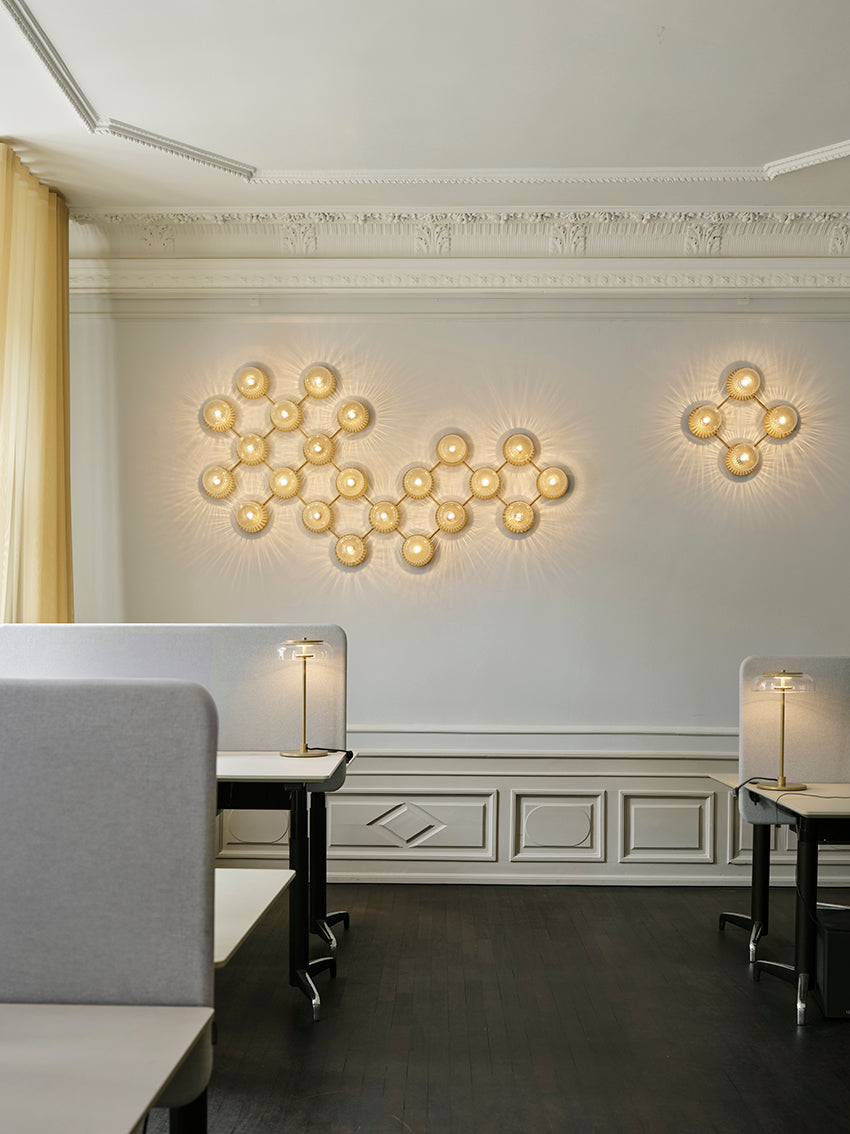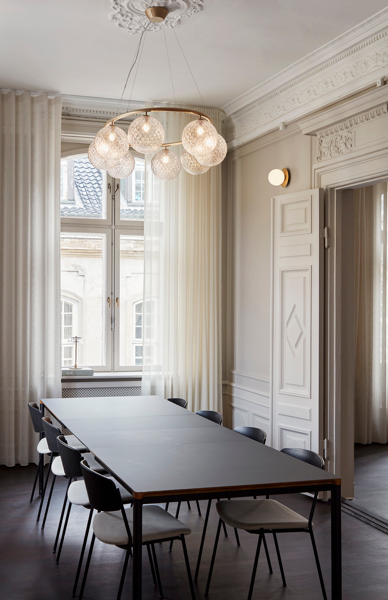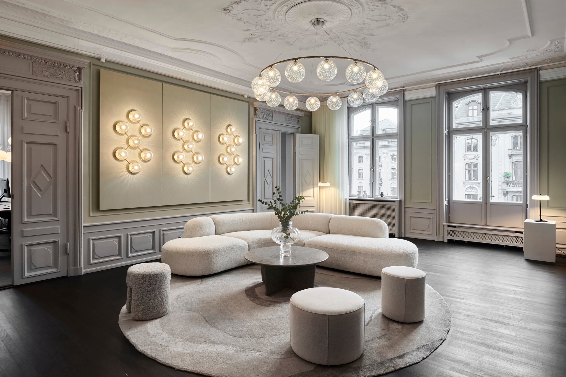 The spaces are illuminated by carefully chosen Nuura lamps, with warm and inviting light highlights the decorative, historical details of the building's architecture. This intentional lighting creates a sensory, holistic experience where aesthetics, functionality, and well-being come together.