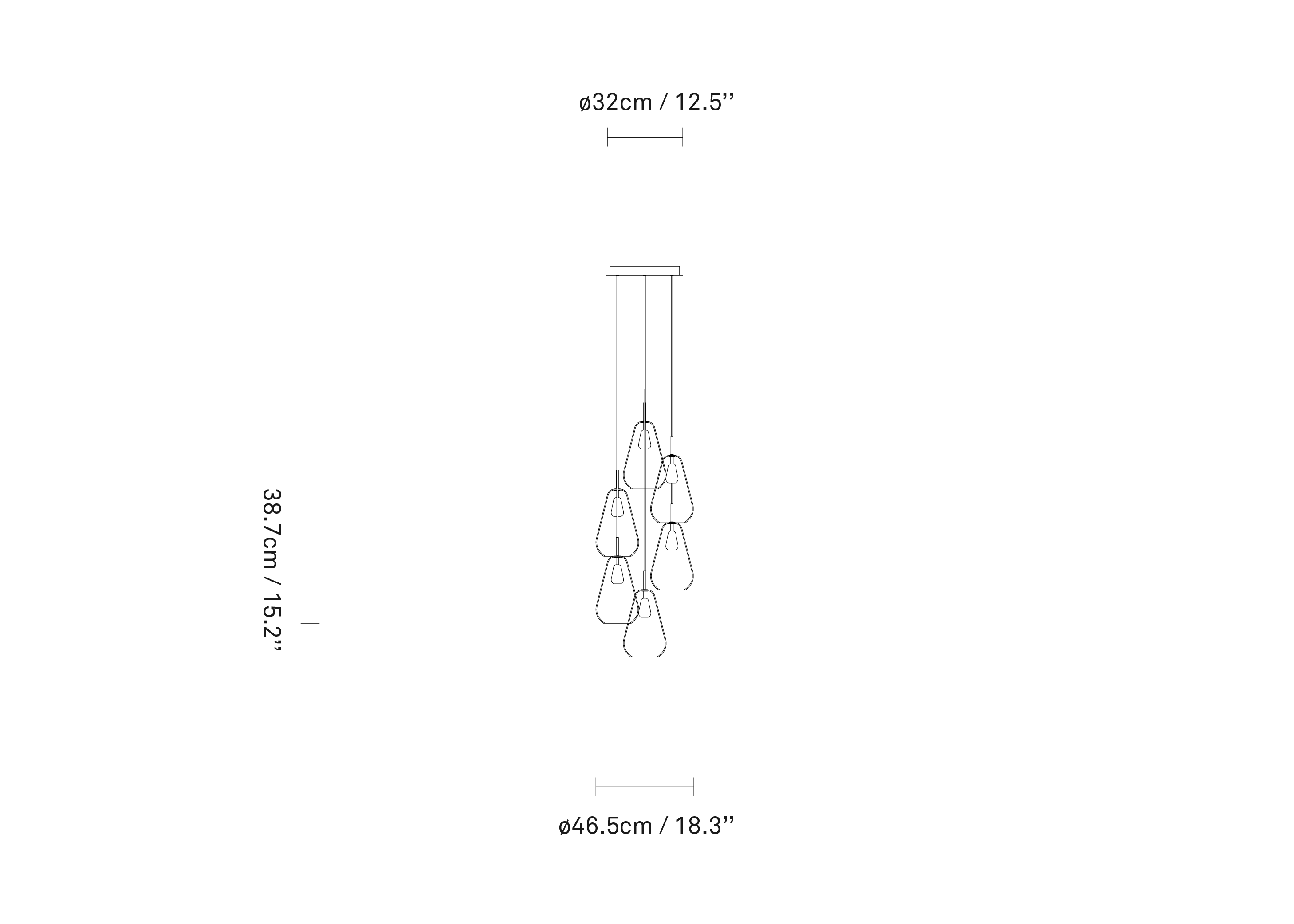Anoli 6 is a large chandelier, inspired by raindrops on a wet September day. The Anoli chandelier is designed as a cluster of lights, consisting of six teardrop-shaped glass pendants. The glass shades are hand-painted with a special lustre which gives the glass a warm, golden tone. The shades are complemented by details in golden metal, while black fabric cords add a subtle contrast element.