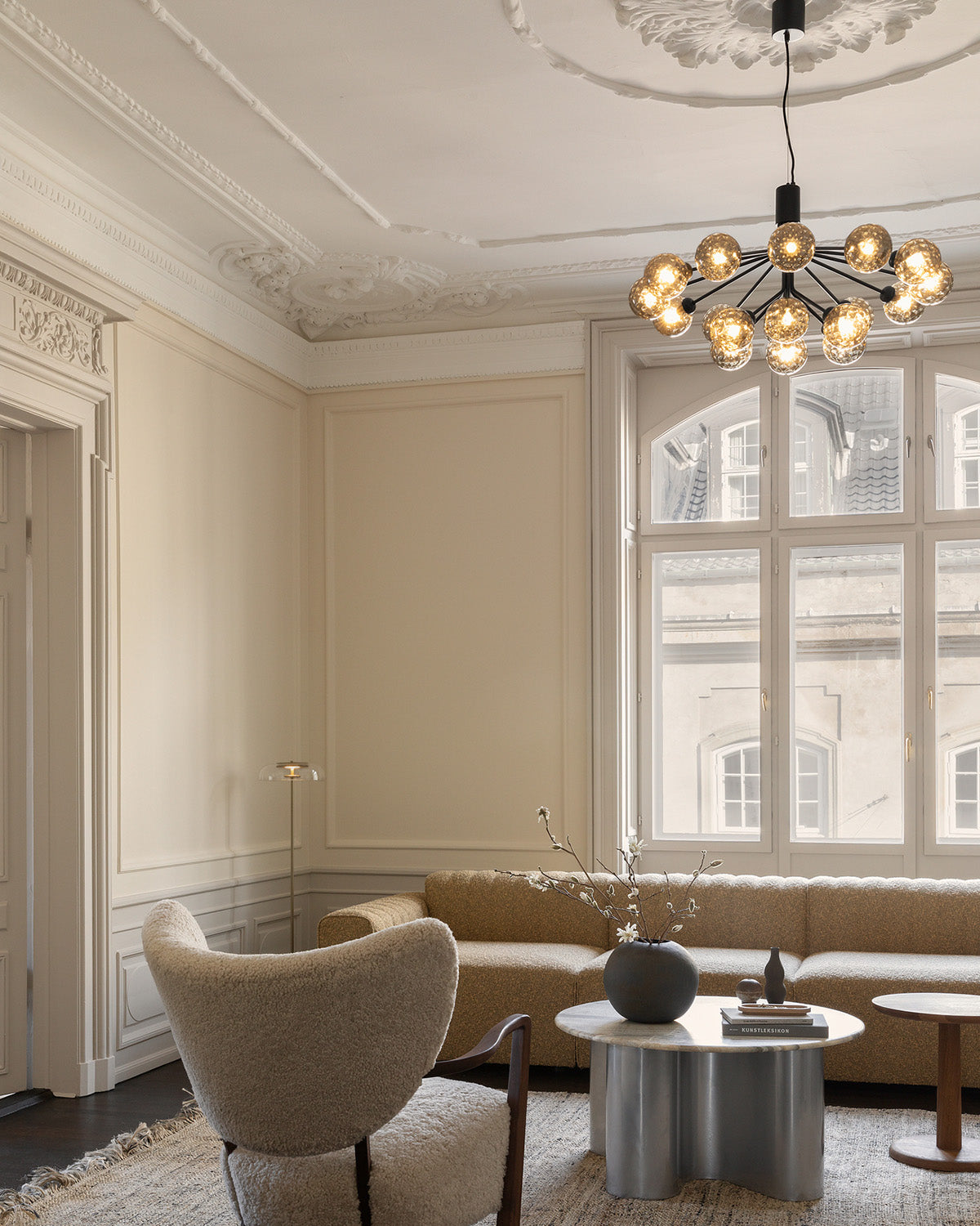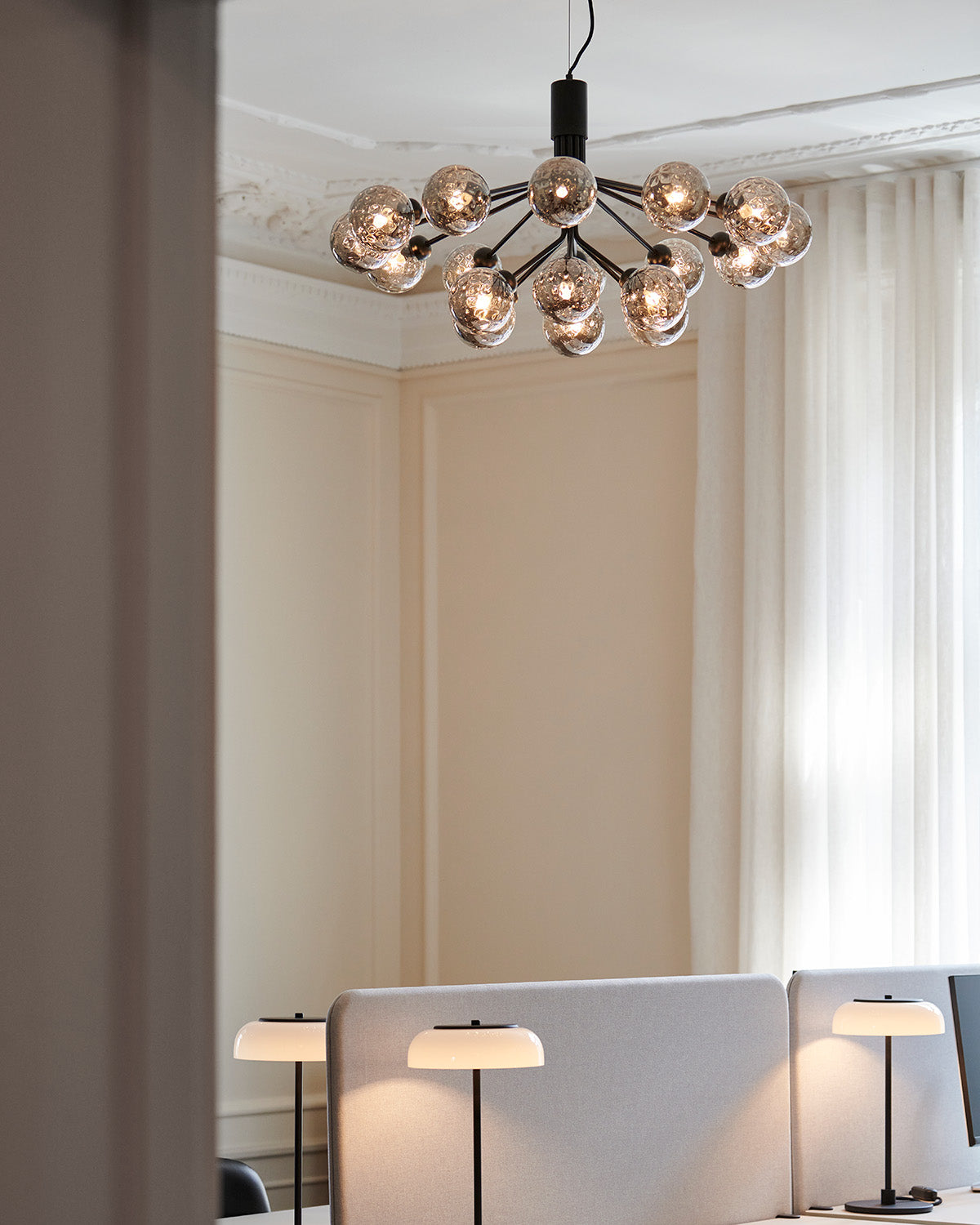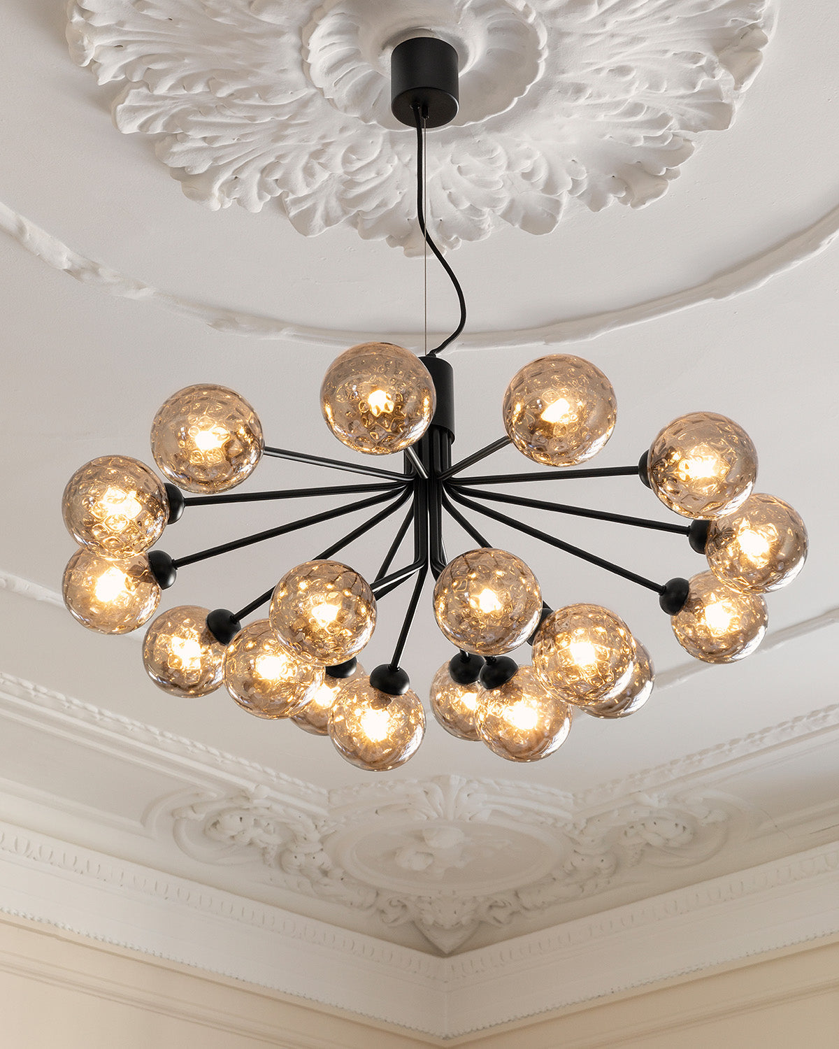 Apiales 18 is a modern chandelier. The sleek metal construction takes inspiration from wildflowers, dressing the single stem and branched arms of the chandelier in a satin black finish. 18 optic smoked glass globes in a black transparent colour are decorated with a soft, diced pattern on the inside, creating an atmospheric sense of light in a room.