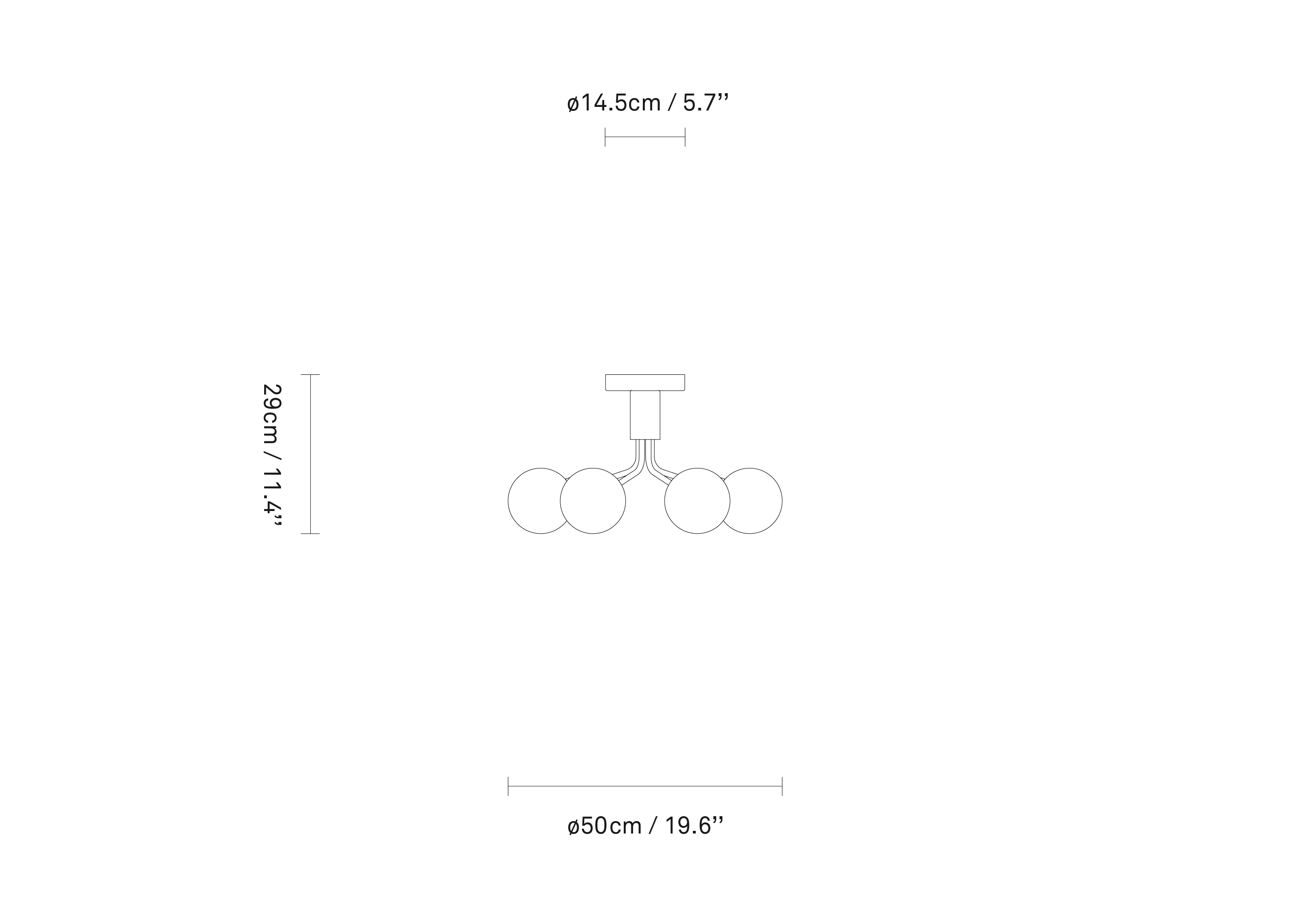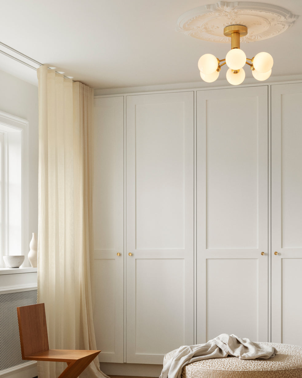 With inspiration from flowers, Apiales 6 Ceiling unfolds its 6 brushed brass metal arms like flower stalks from a specially produced canopy, supporting 6 mouth-blown glass globes in opal white. Apiales 6 Ceiling has a height of just 29 cm and offers ample light coverage in rooms with limited space available.