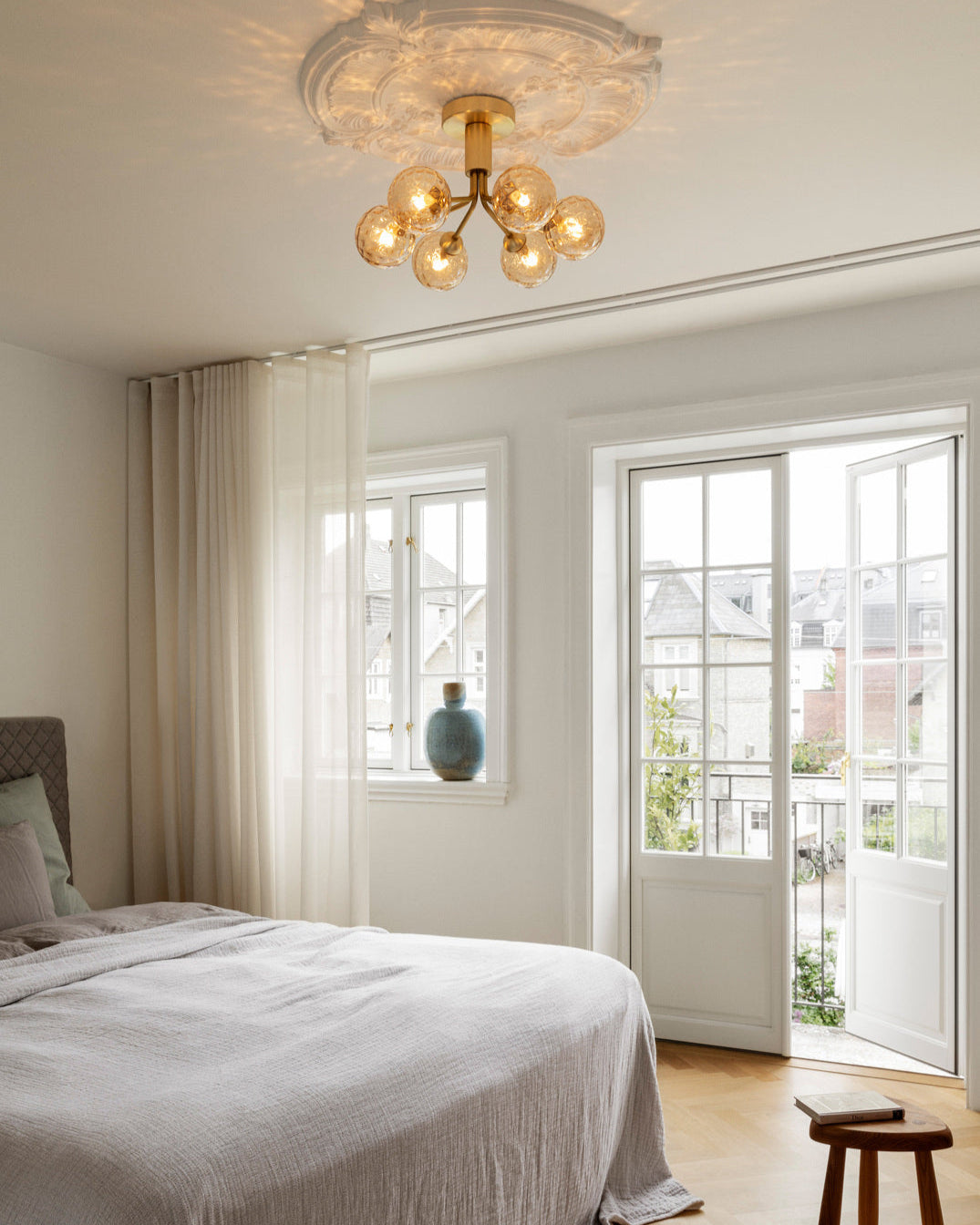Apiales 6 Ceiling is a new addition to the Apiales collection, inspired by the look of umbellifer flowers. With a height of just 29 cm, Apiales 6 Ceiling adds decorative lighting to lower ceilings while freeing up overhead space. The optic gold glass globes add a welcoming warmth.