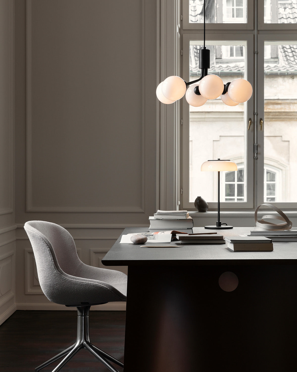 Apiales 6 is a multi-light pendant inspired by the classic pendant and chandeliers from the Apiales collection. The lamp’s body leads to six metal arms that create a deep contrast to the opal glass globes from where a soft and pleasant light spread.