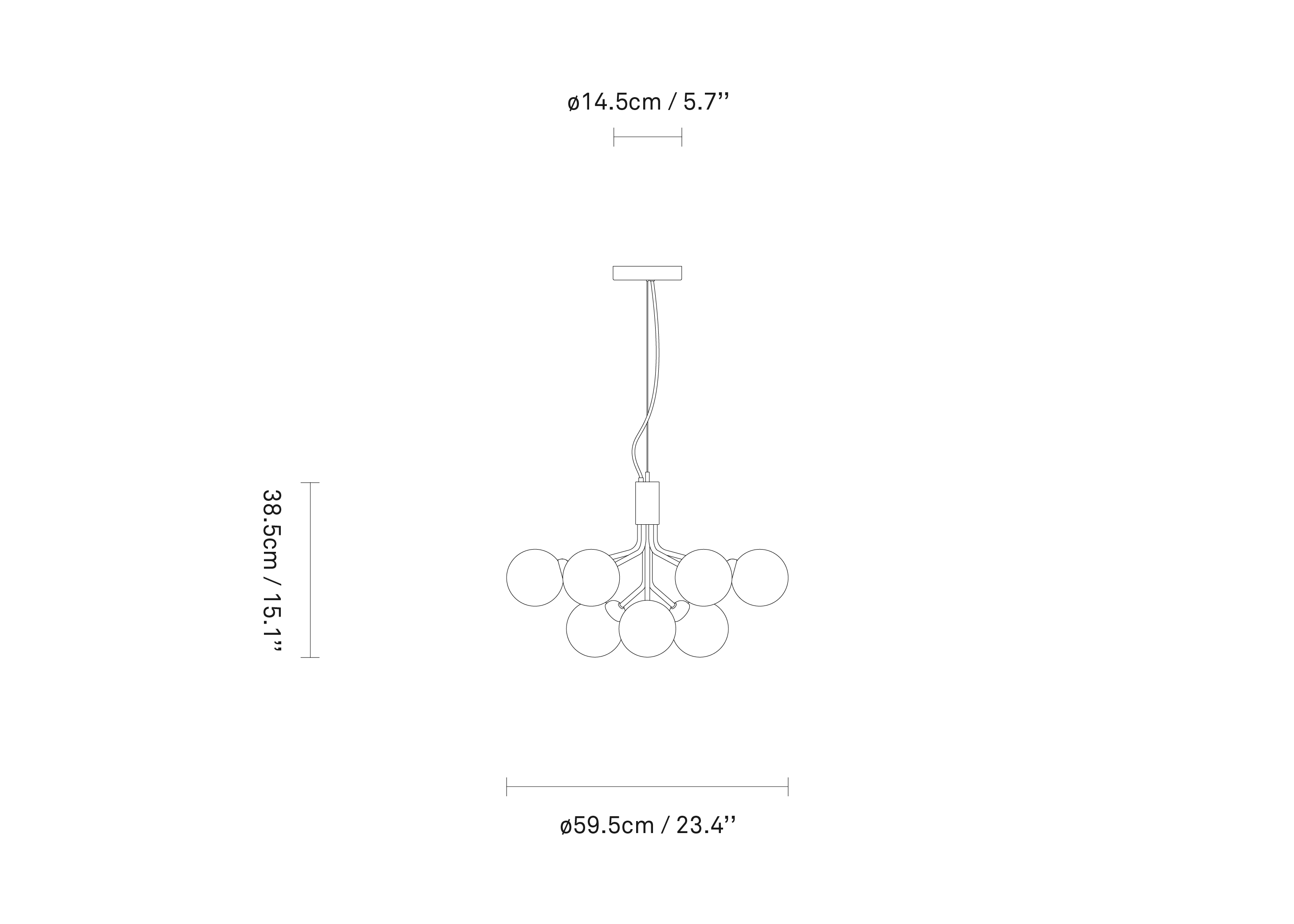 With inspiration from flowers, Sofie Refer has designed the Apiales collection. The collection consists of two chandeliers with 9 or 18 mouth-blown glass globes and is available in golden Brushed Brass finish or the smooth Satin Black. From a specially-produced canopy, the arms unfold like flower stalks from which light is spread with grace.