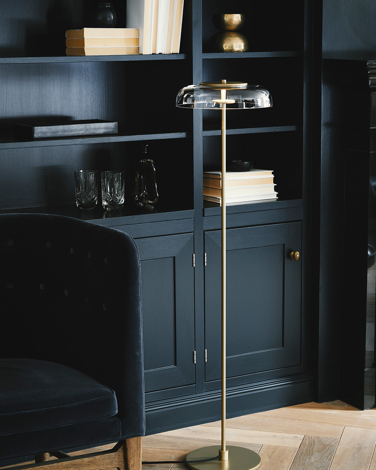 Blossi Floor is a floor lamp with a timeless Scandinavian expression, designed with mouth-blown clear glass and a golden metal finish. The golden surface reflects the light, creating a warm and atmospheric glow. The low-voltage version features a replaceable LED board, ensuring flicker-free light while meeting the latest EU regulations. The light is softly diffused through the glass for a comfortable illumination. Comes with a dimmable cable and both EU and UK plugs.