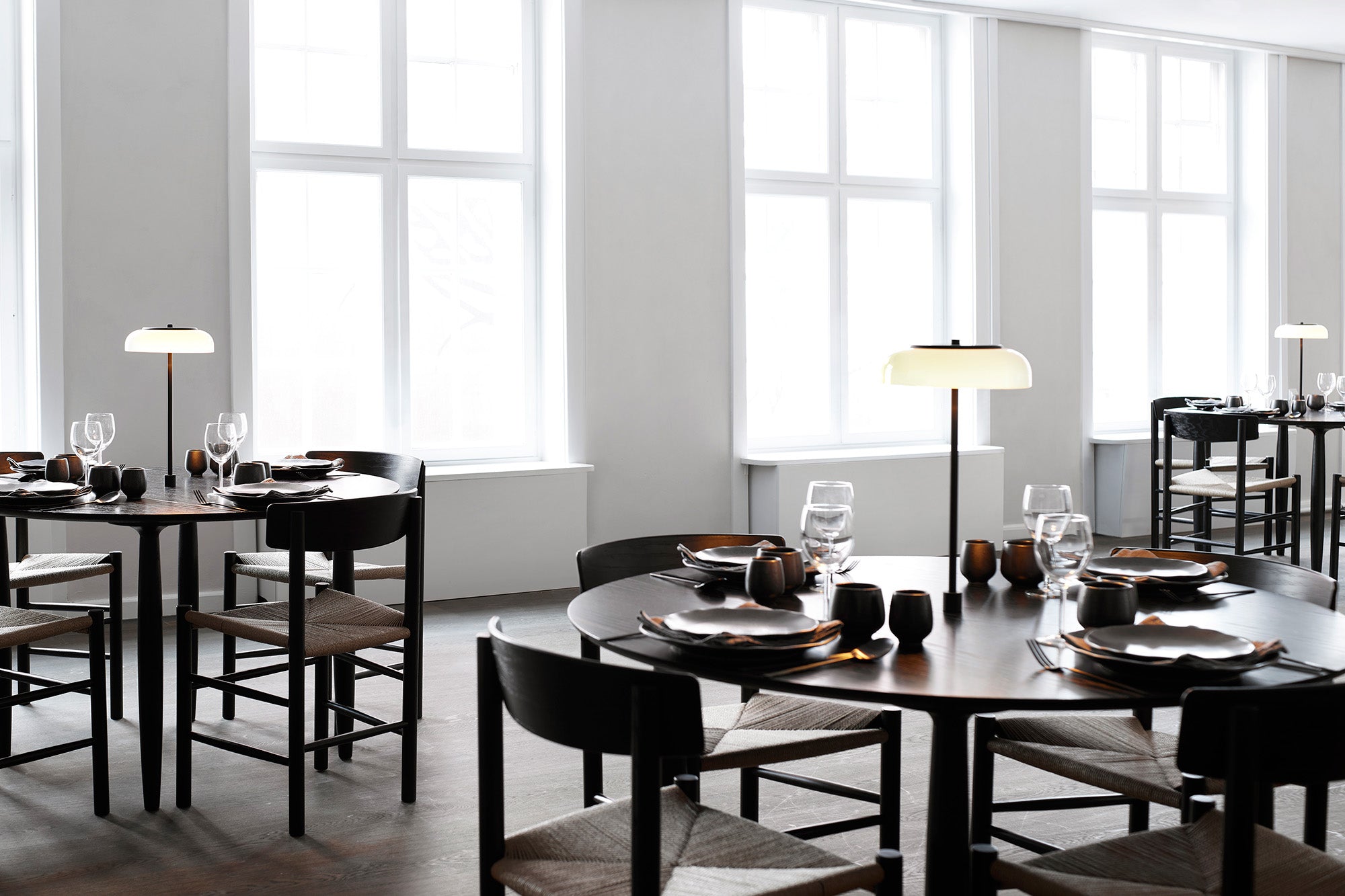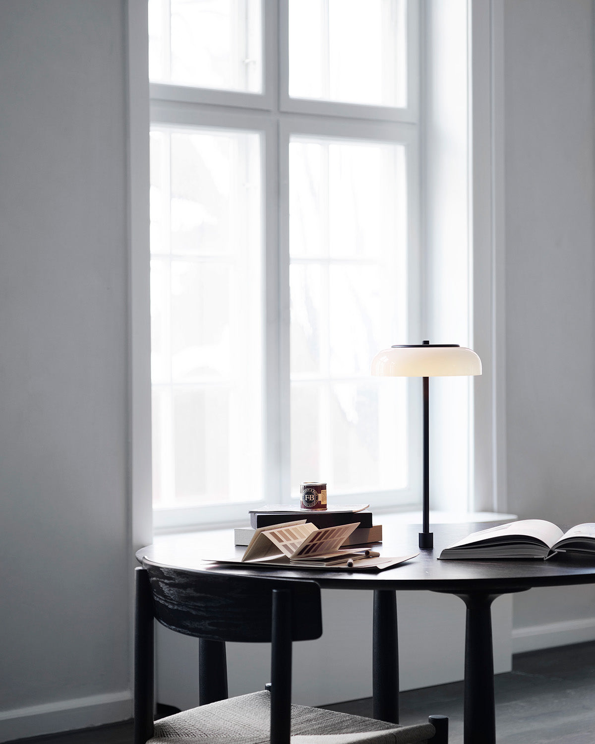 Blossi Table In-set is a fixed, integrated table lamp. The smooth, velvety black metal finish and opal white mouth-blown glass offer a clean and contrasting expression. The Blossi collection is produced with an easily replaceable LED card, offering a flicker-free light and meeting the latest EU lighting energy efficiency regulations. The specially-produced dimmable LED disc is carefully placed to ensure that the light is reflected by the glass shade, spreading a soft, indirect light to the immediate surroundings. Cable with dimmer and EU + UK plug.