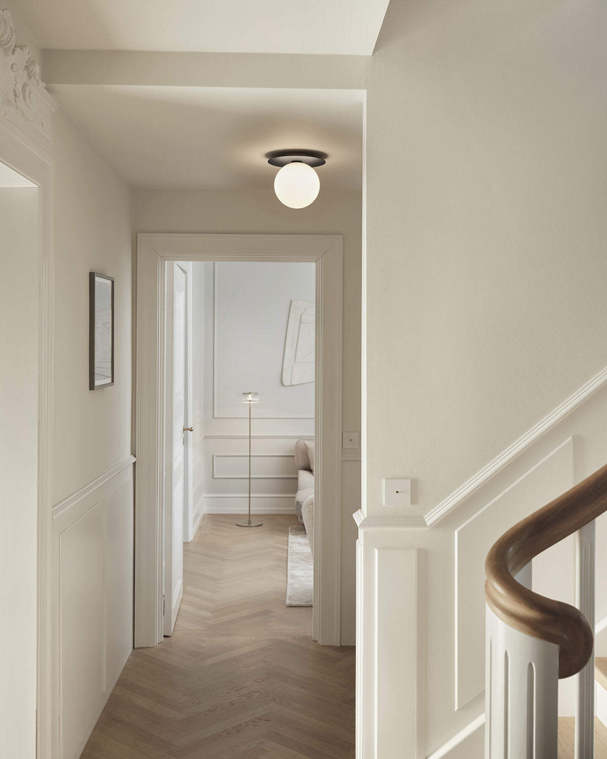 Liila 1 Large is a single lamp designed for mounting as either a ceiling or wall lamp. The design features a thin metal disc in a black finish and a large, hand-blown opal white glass shade, giving the lamp a classic and timeless expression. Additionally, the lamp is IP44 rated.