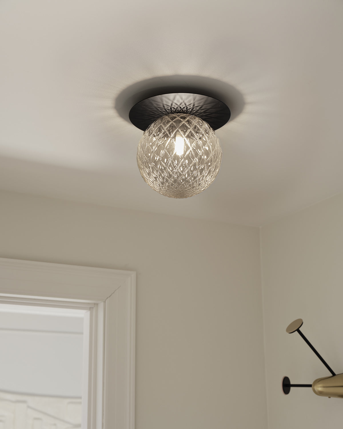 Liila 1 Large is a single lamp well suited either as a flushmount ceiling light or as a wall sconce. Designed with a thin round sheet of metal in black finish and a large mouth-blown globe in optic clear glass from which the light is spread and reflected in the metal disc.