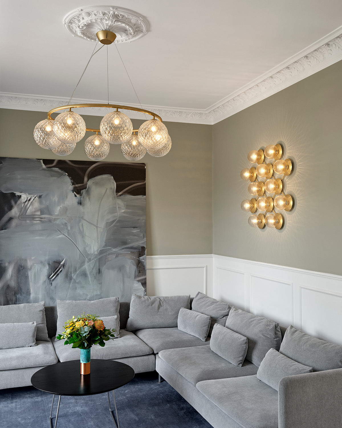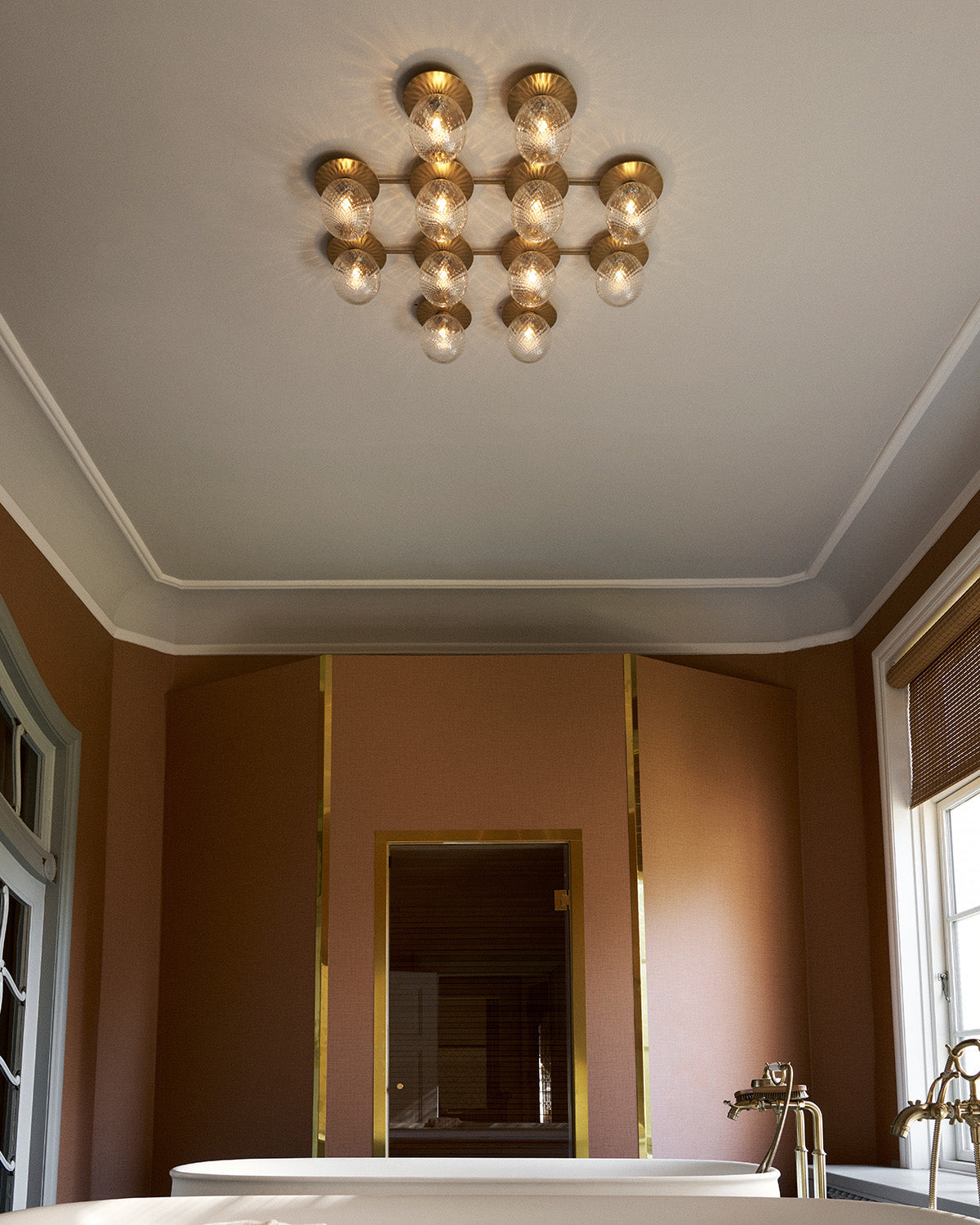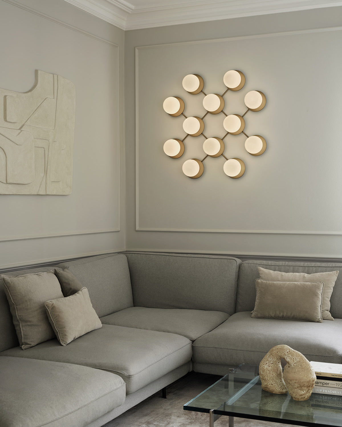 Liila 12 is a sophisticated lamp that seamlessly merges function and aesthetics into a decorative work of art for walls or ceilings. The design features 12 elegant, circular metal plates that create a light and floating effect around the clear glass domes. Its minimalist and modular construction is distinguished by details that reflect the Nordic design tradition.