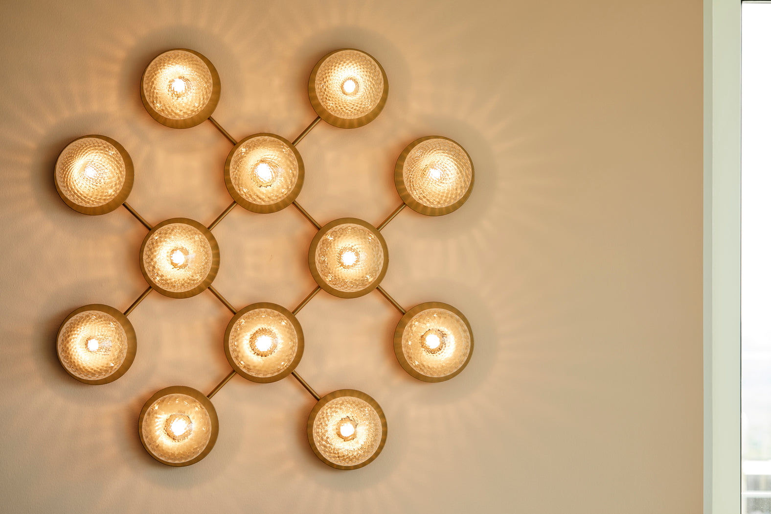 Liila 12 is a sophisticated lamp that seamlessly merges function and aesthetics into a decorative work of art for walls or ceilings. The design features 12 elegant, circular metal plates that create a light and floating effect around the clear glass domes. Its minimalist and modular construction is distinguished by details that reflect the Nordic design tradition.