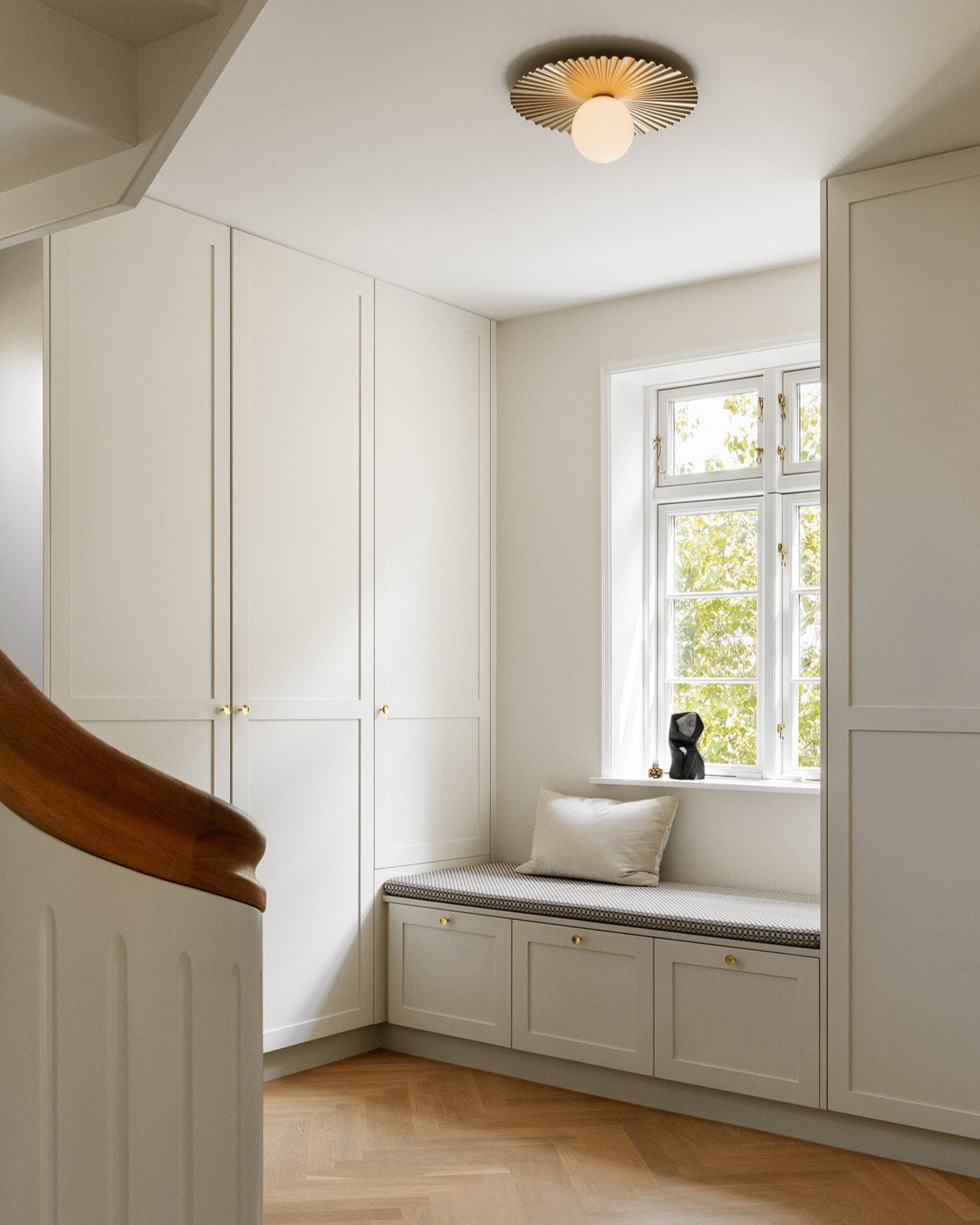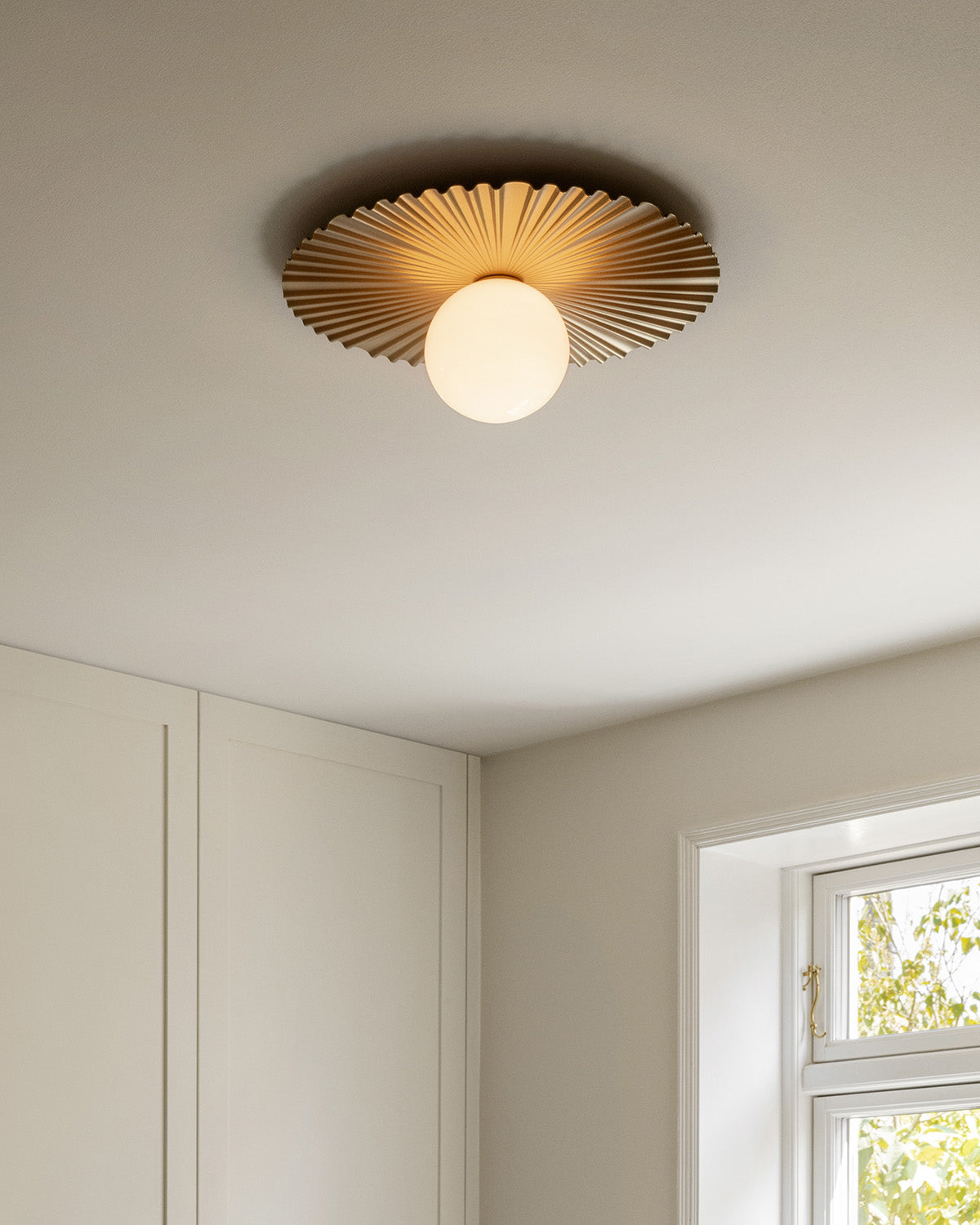 Liila Muuse Medium is a wall and semi-flushmount ceiling lamp with references to the old amusement park, Tivoli, in Copenhagen. The round backplate is updated with asymmetric curves, creating this playful lamp design.