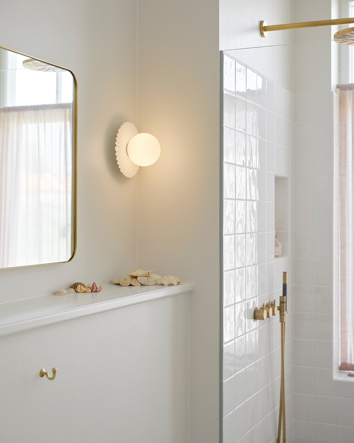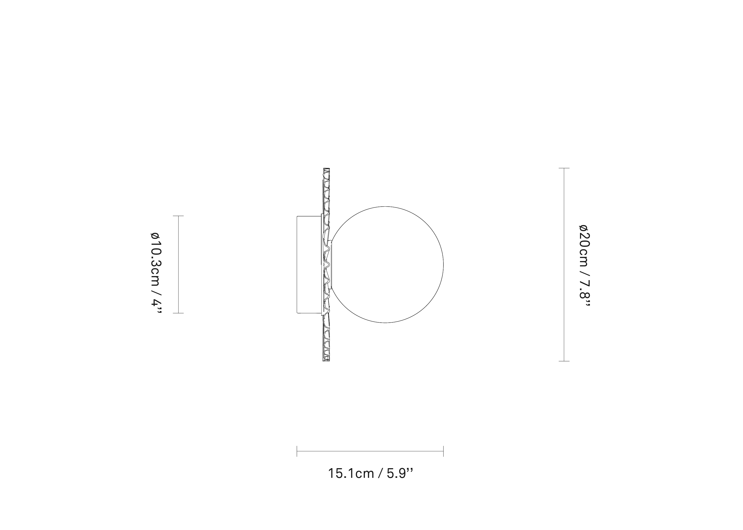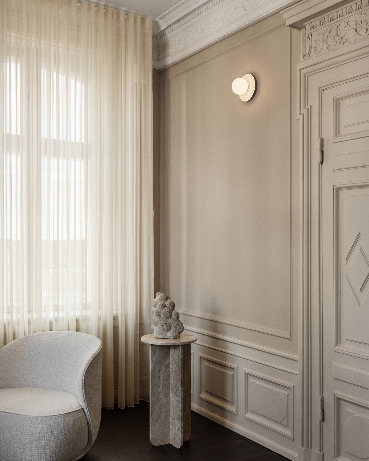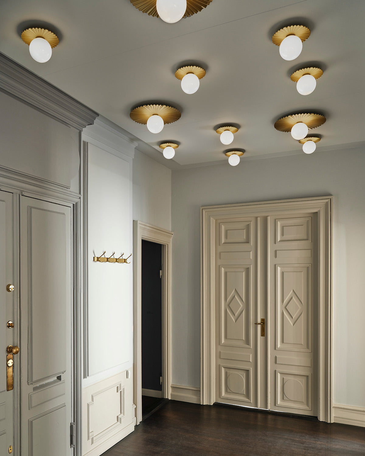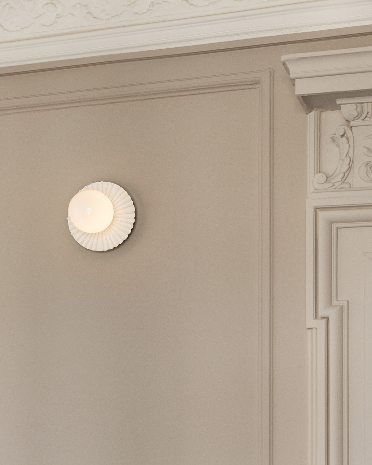 Liila Muuse Small is a wall and ceiling light with an artistic expression. The round metal back plate is styled with asymmetric waves, reflecting the light from the small opal white glass globe placed in the middle of the lamp. The soft curves and white powder coating create associations to the classic white ceiling medallions in older buildings.