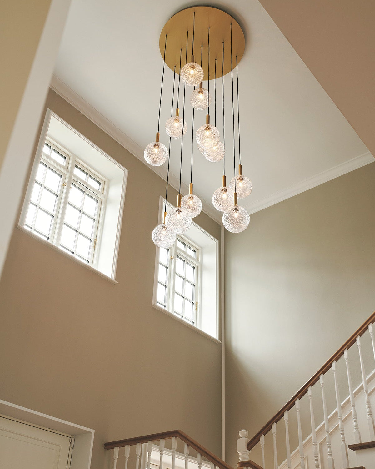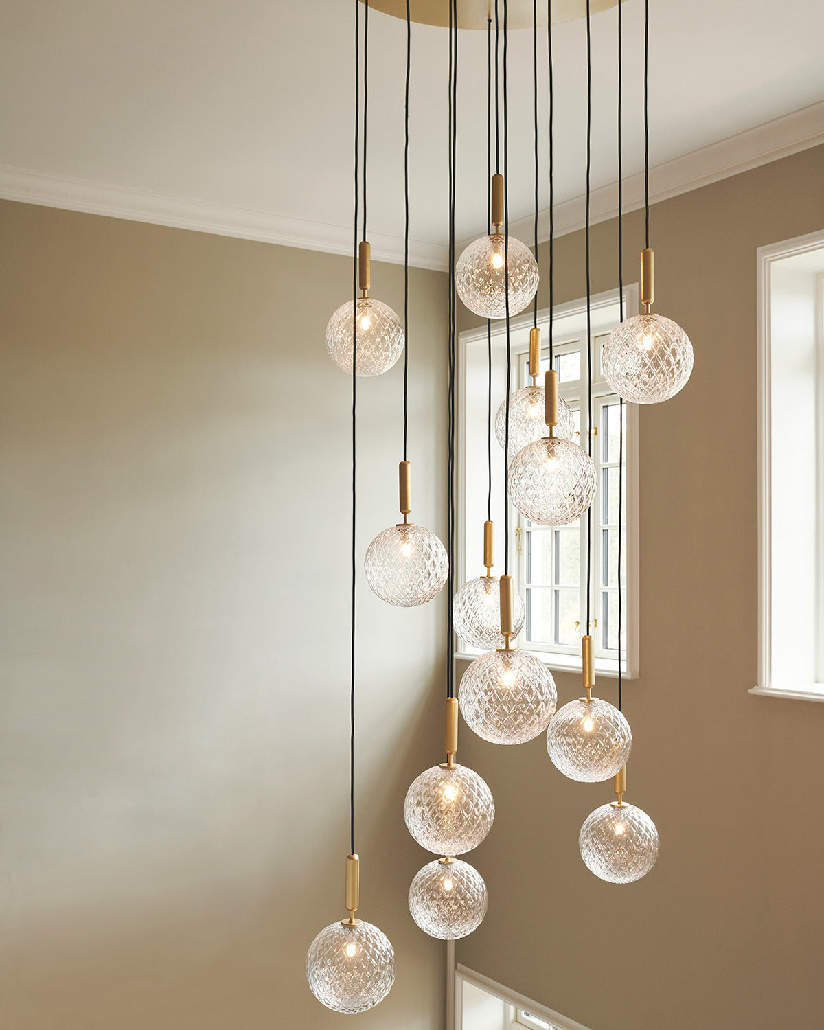 Miira 13 Large is an extraordinary chandelier consisting of 13 single pendants gathered in a large ceiling plate to create the chandelier expression. Each of the 13 single pendants are ample and weighty, and the large glass globes add a bold expression to the room.