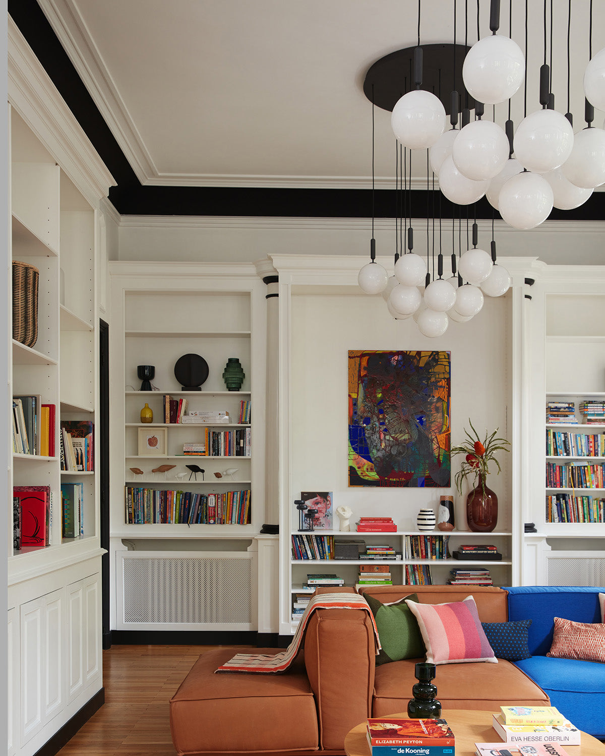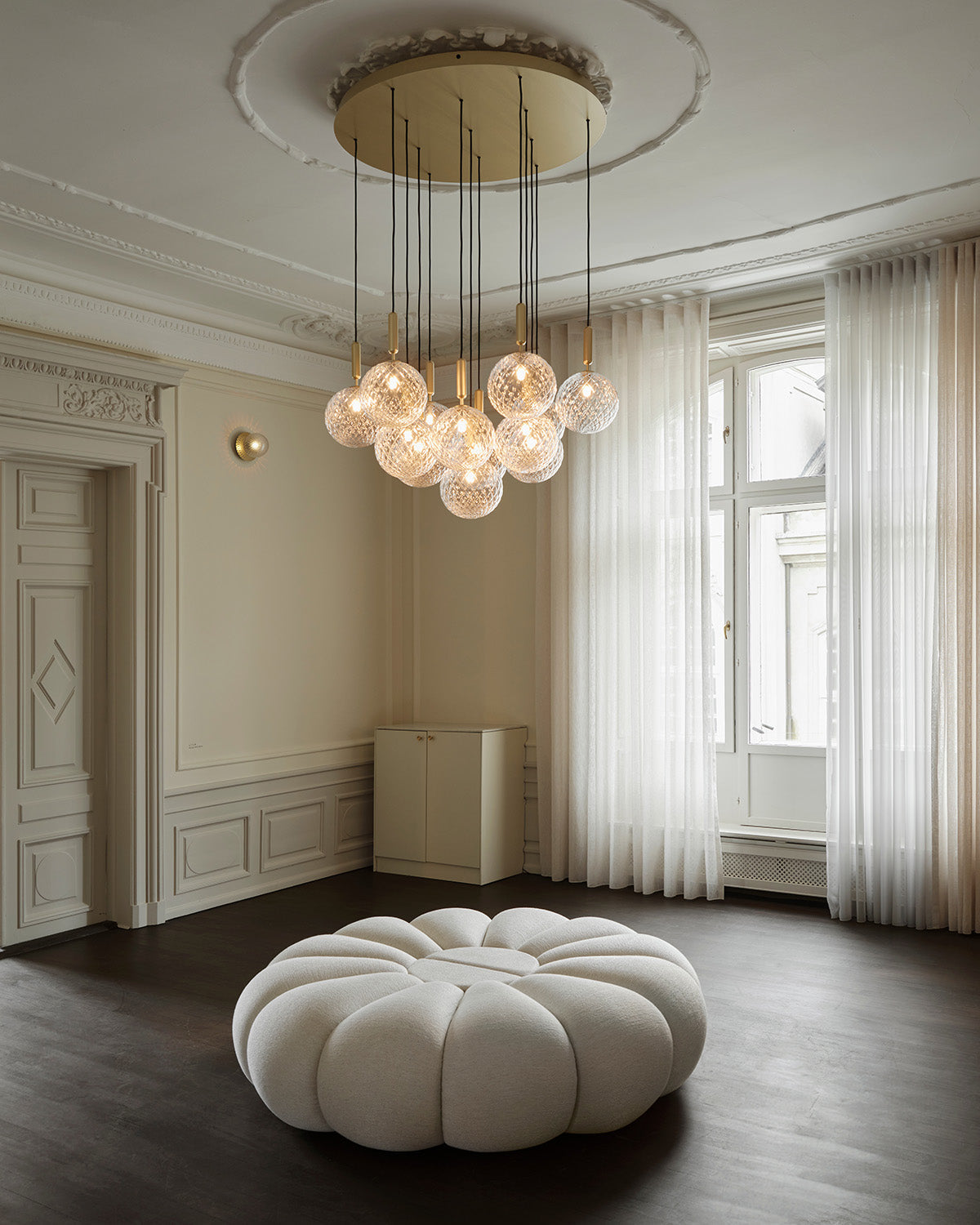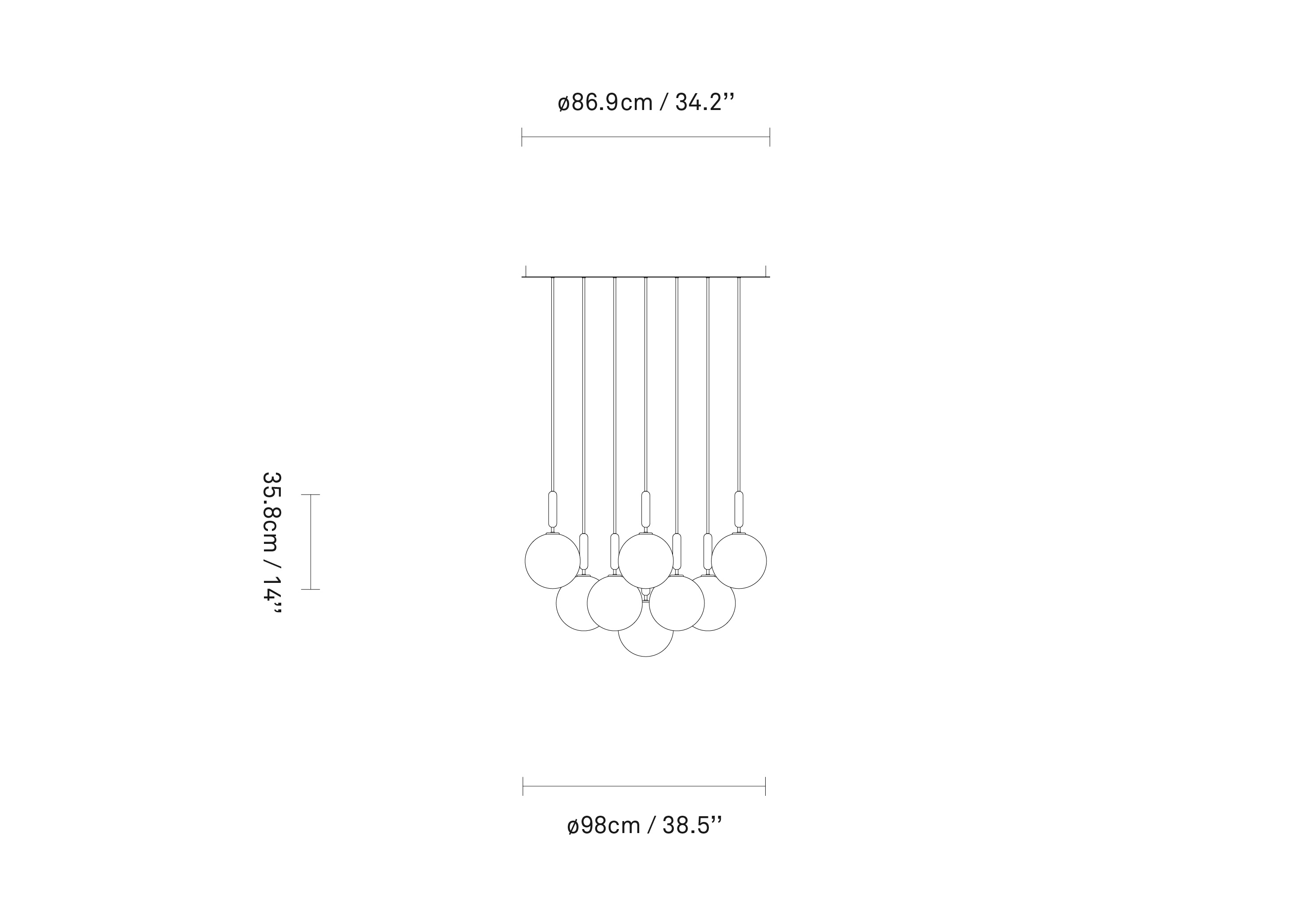 Miira 13 Large is an extraordinary chandelier consisting of 13 single pendants gathered in a large ceiling plate to create the chandelier expression. Each of the 13 single pendants are ample and weighty, and the large glass globes add a bold expression to the room.