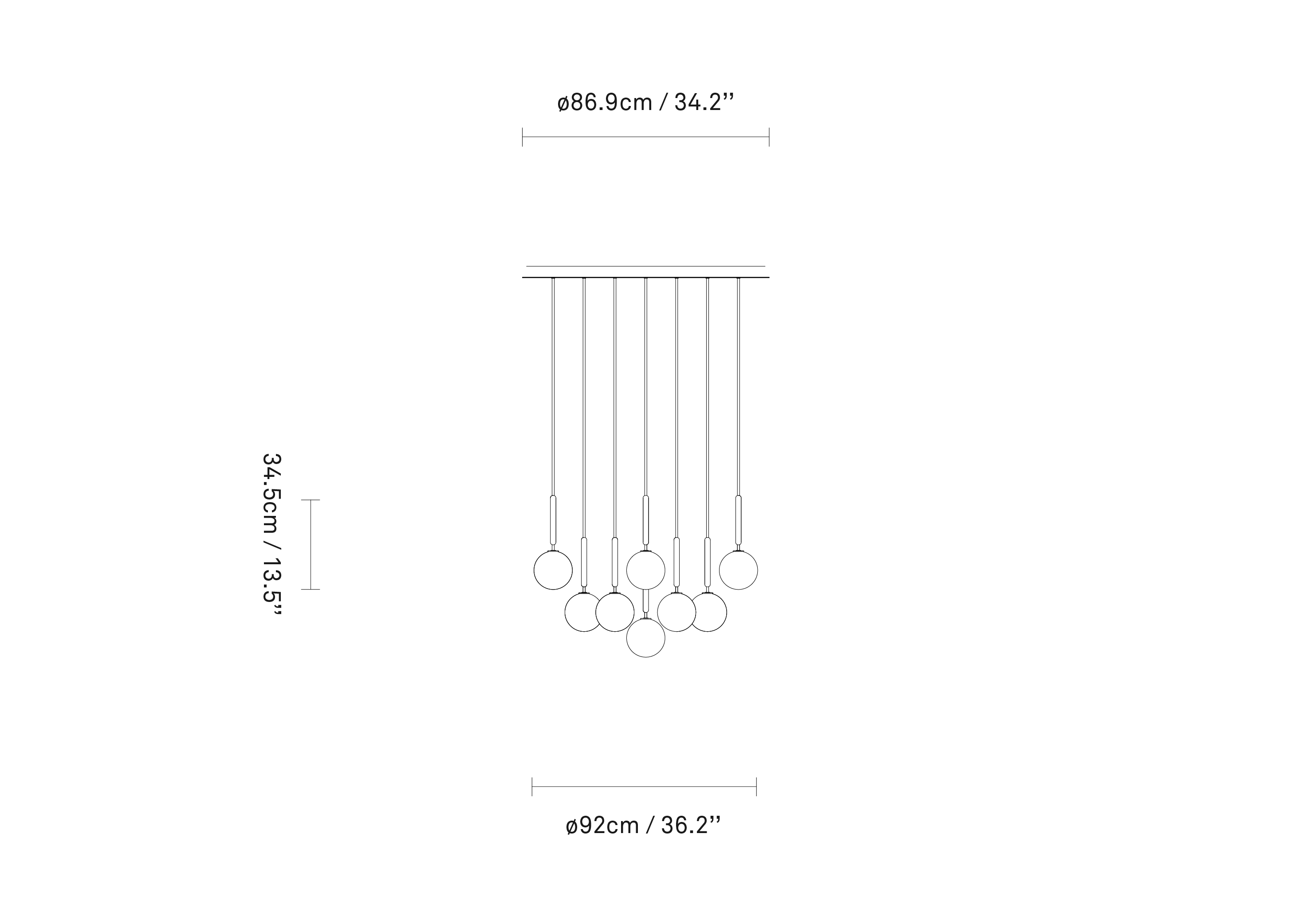 Miira 13 is a chandelier with 13 single pendants attached to a round ceiling plate, creating the chandelier appearance. The pendants can be adjusted in different formations. The Miira 13 chandelier has a light and narrow silhouette with glass globes of Ø14 cm in diameter whereas the Miira 13 Large has an ample and weighty expression.