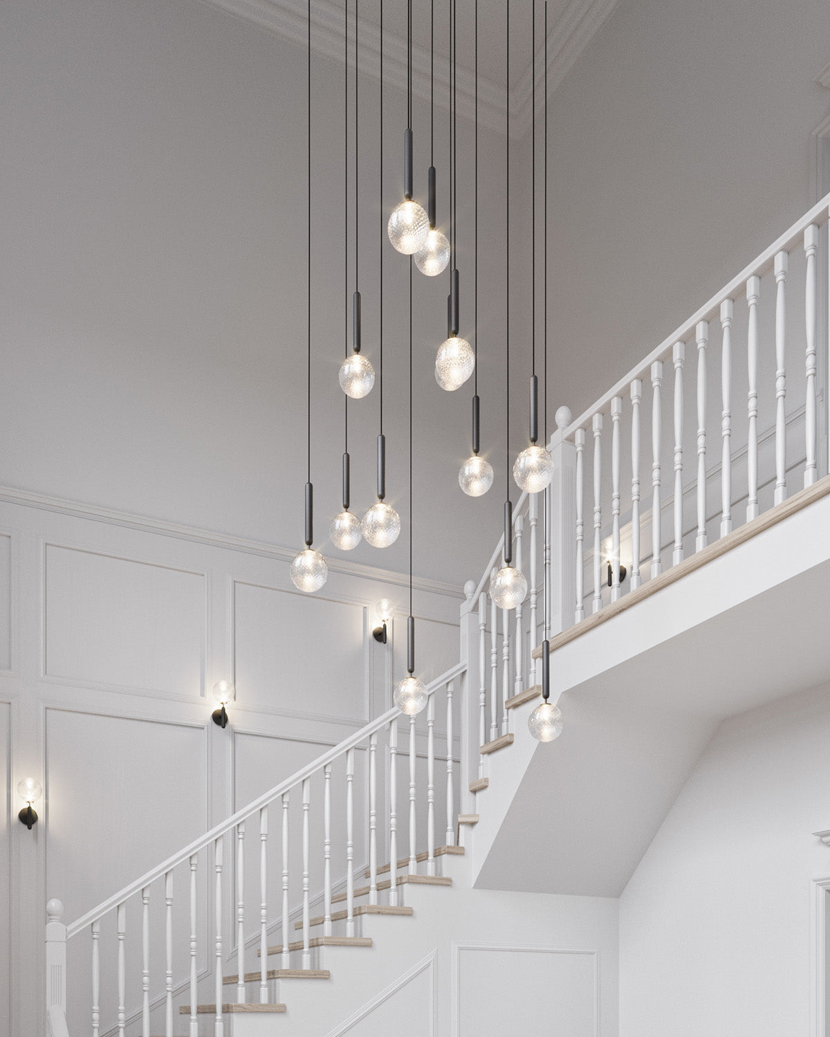Miira 13 is a chandelier with 13 single pendants attached to a round ceiling plate, creating the chandelier appearance. The pendants can be adjusted in different formations. The Miira 13 chandelier has a light and narrow silhouette with glass globes of Ø14 cm in diameter whereas the Miira 13 Large has an ample and weighty expression.