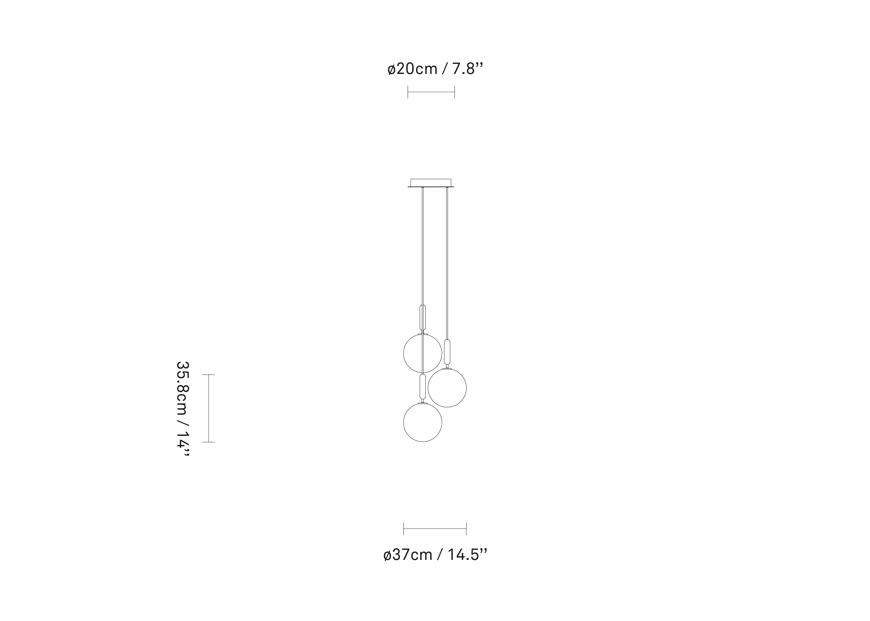 Miira 3 Large is a modern chandelier consisting of 3 pendants in a multi-light formation. The single pendants are suspended from the ceiling plate, and the sleek metal rods and bold glass globes make the pendants pop in the air.