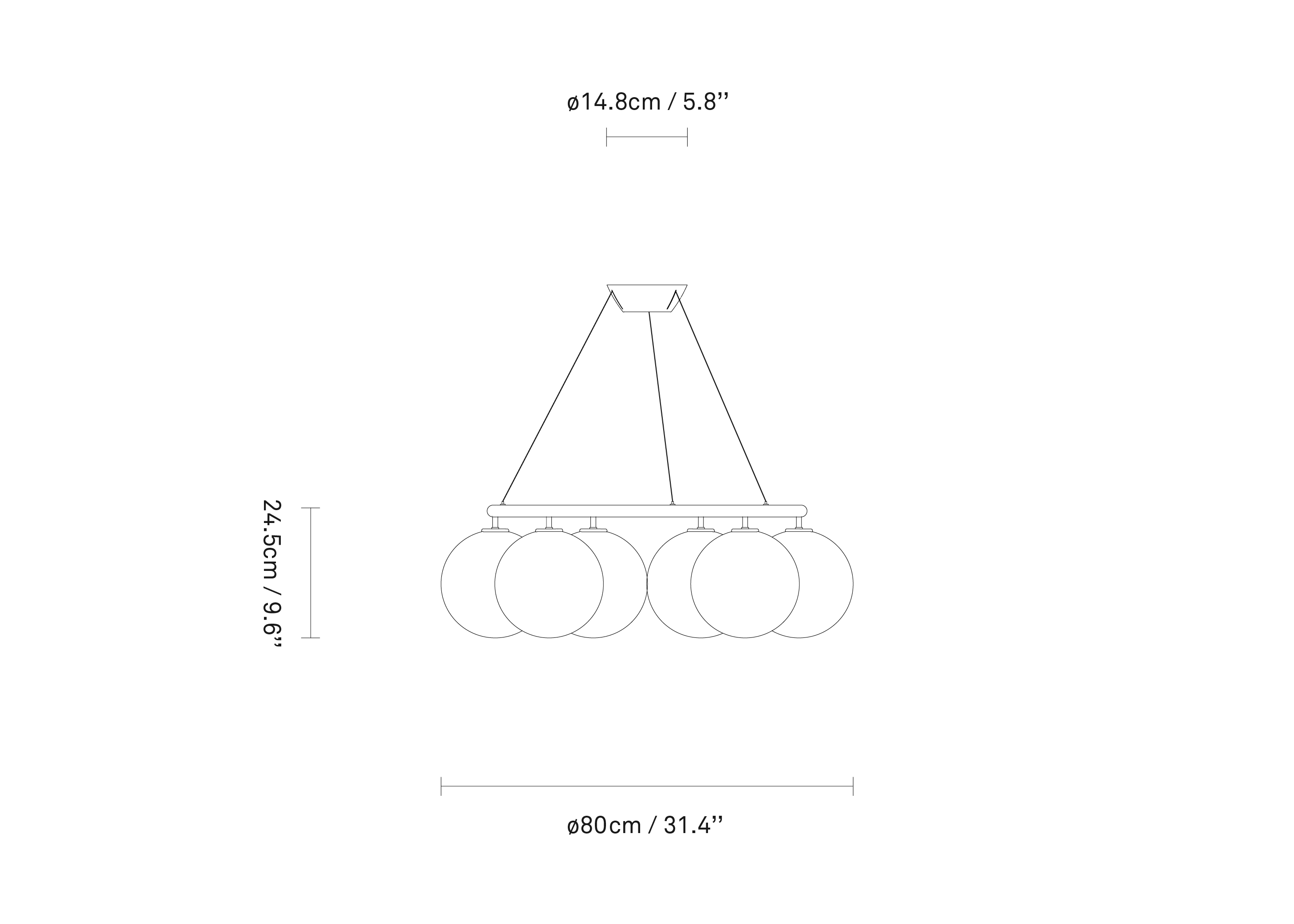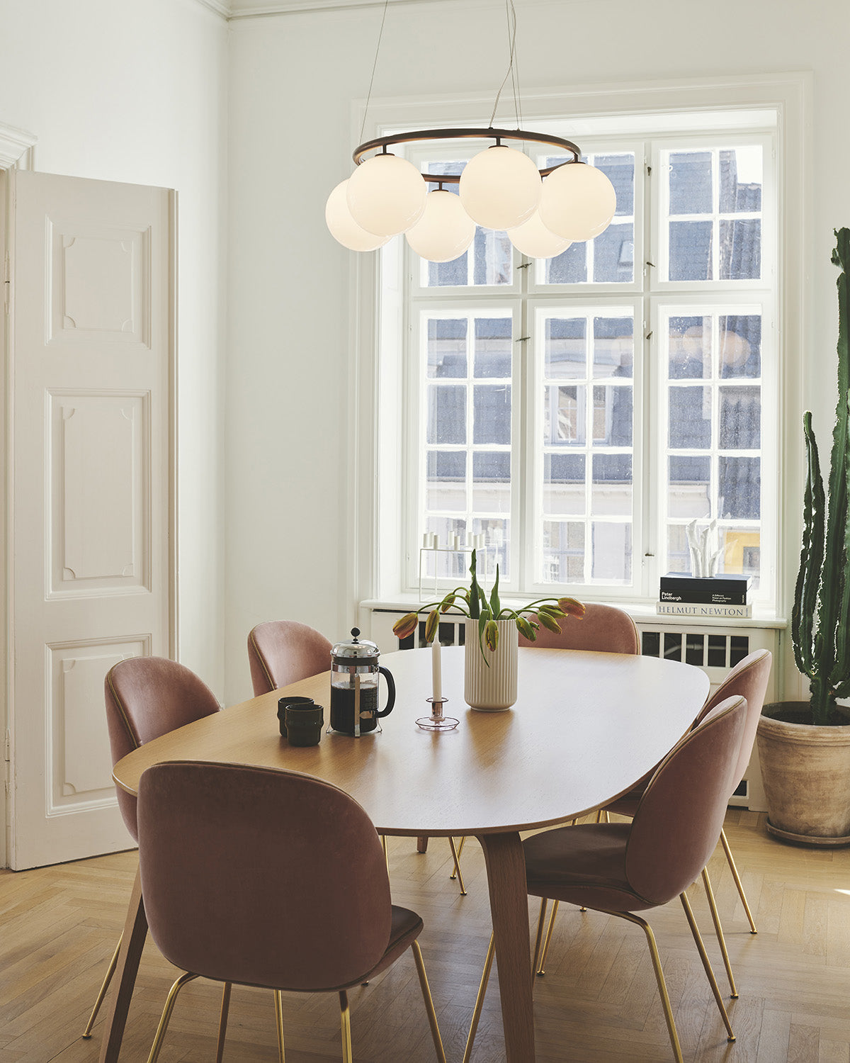 Miira 6 Circular is a modern chandelier designed with a round metal ring in dark bronze-colored metal. Six hand-blown opal white glass globes hang from the metal structure, creating a refined and elegant look. With a specialized wire system between the ceiling plate and the metal ring, Miira 6 Circular can be adjusted to the ideal height.
