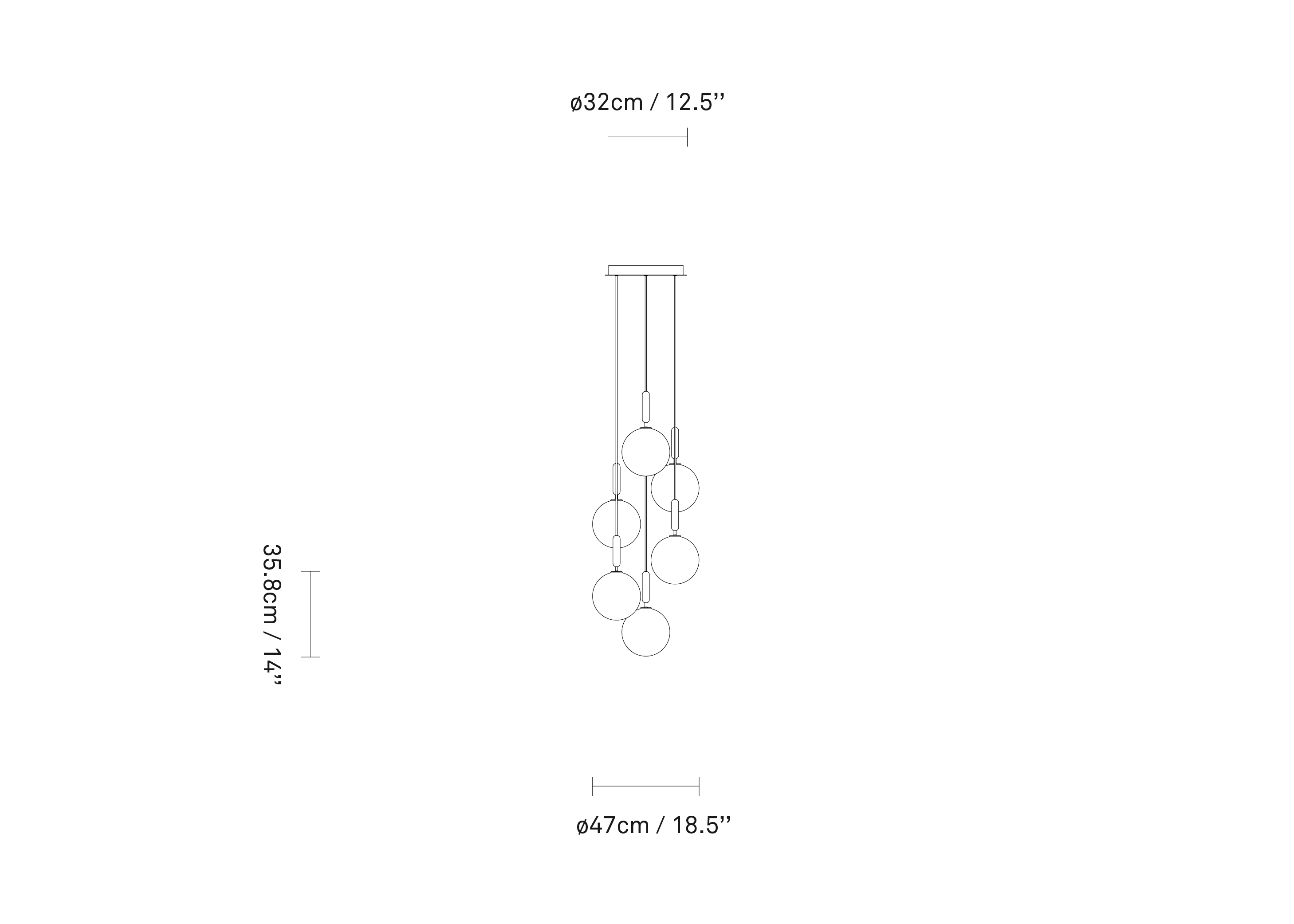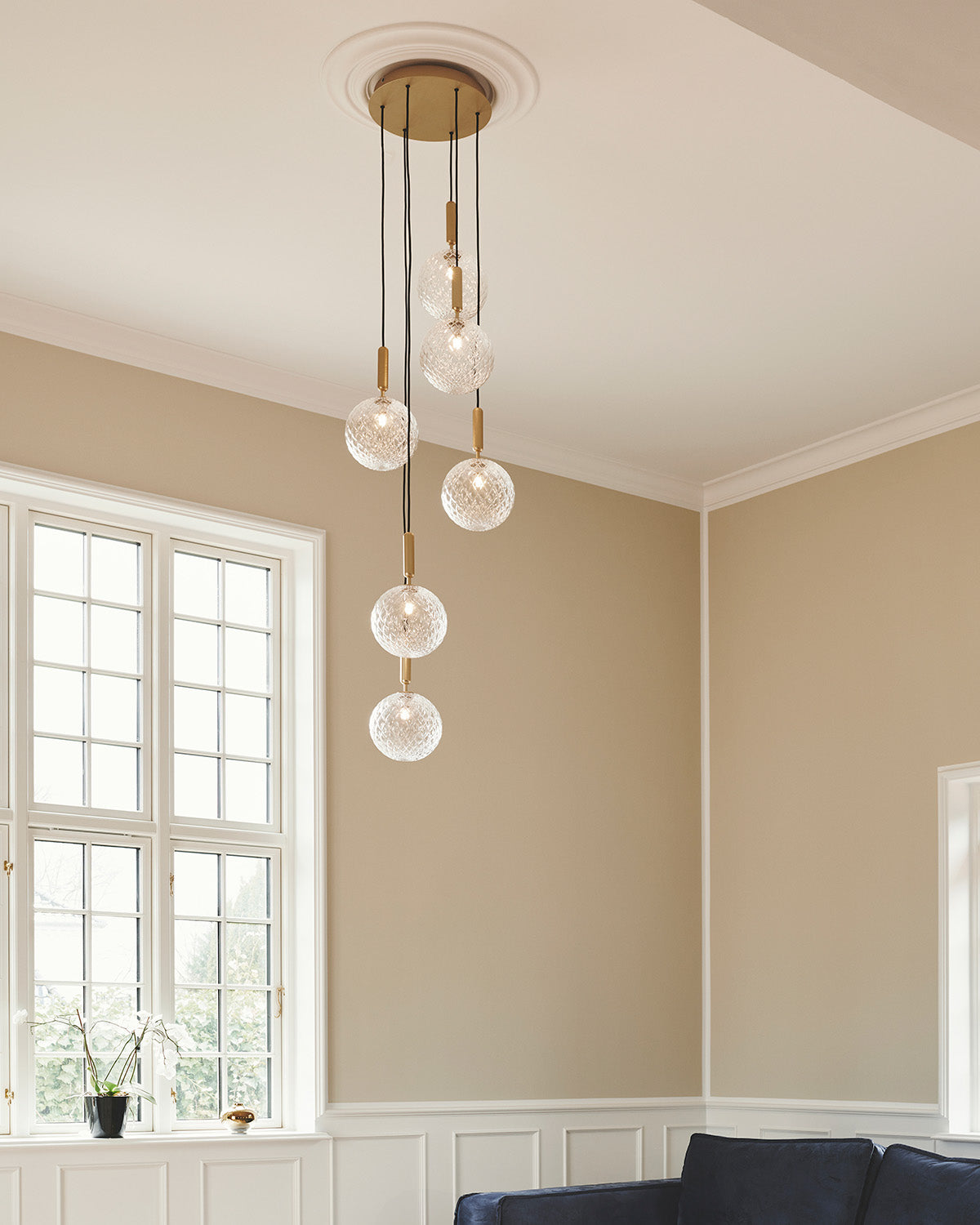 Miira 6 Large is a chandelier consisting of 6 single pendants gathered in a large ceiling plate to create the chandelier expression. The pendants can be adjusted in different formations. Each of the 6 pendants are ample and weighty and the large glass globes each have a diameter of Ø20 cm, resulting in a bolder appearance than the light and narrow pendants from the standard Miira series.