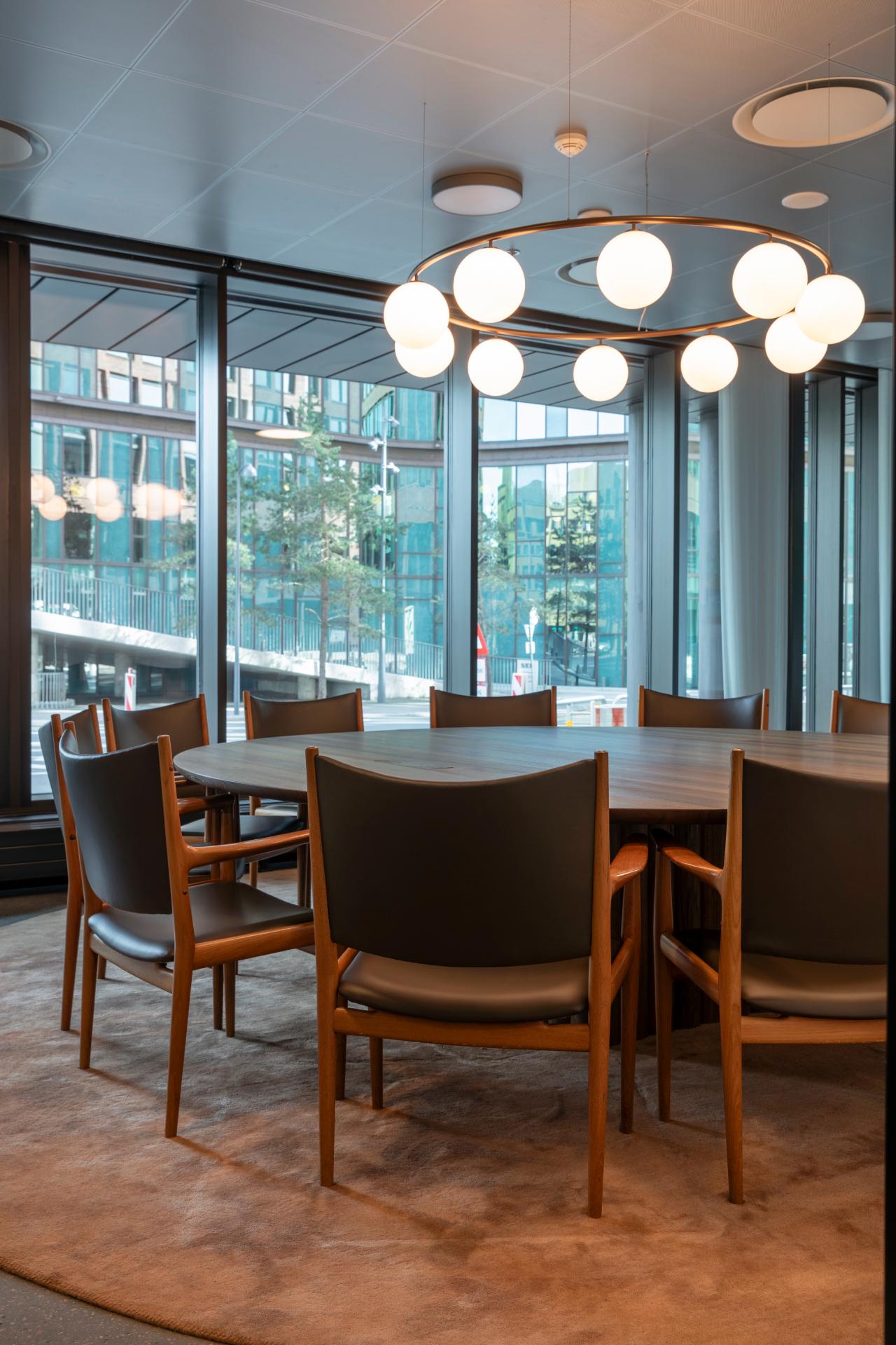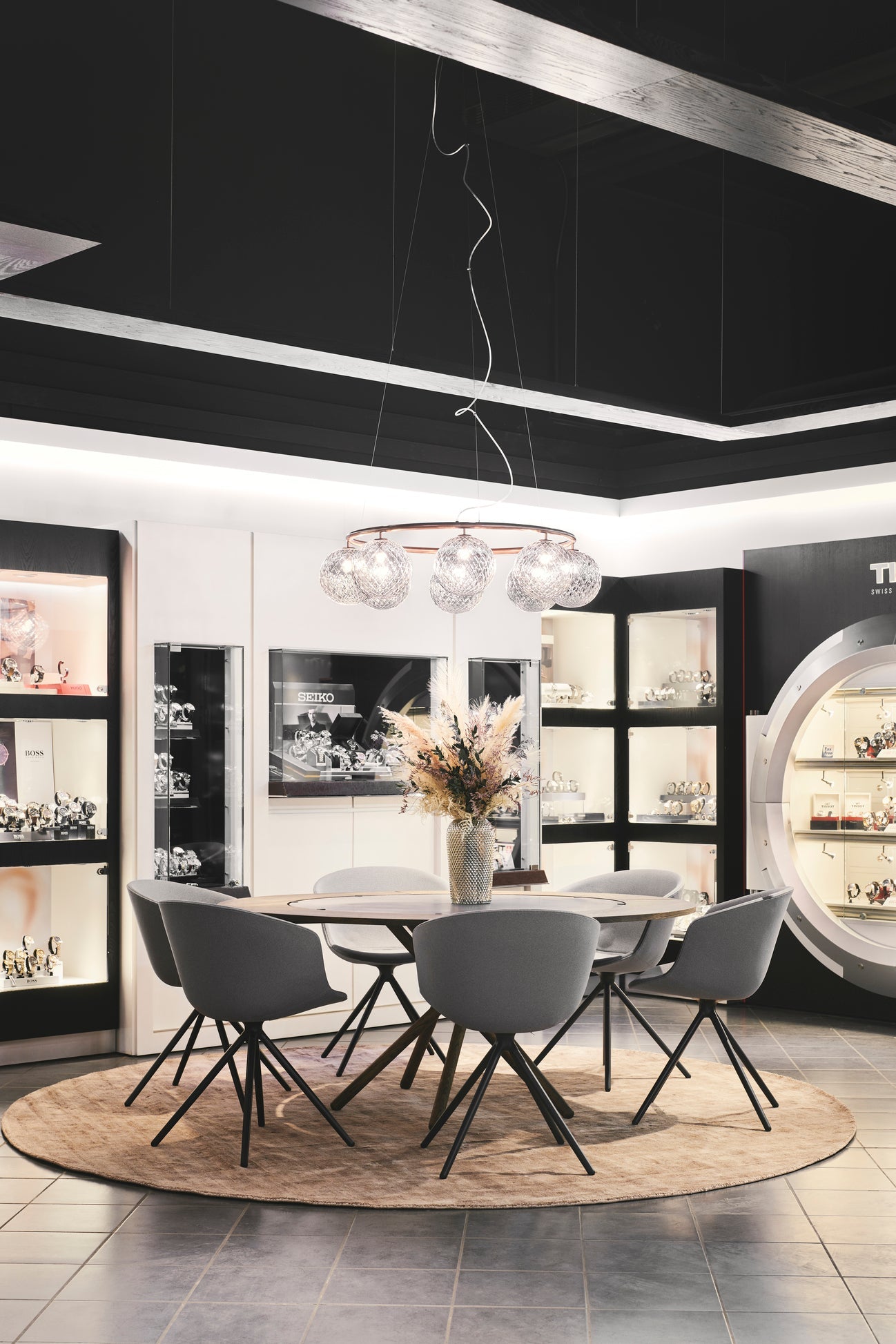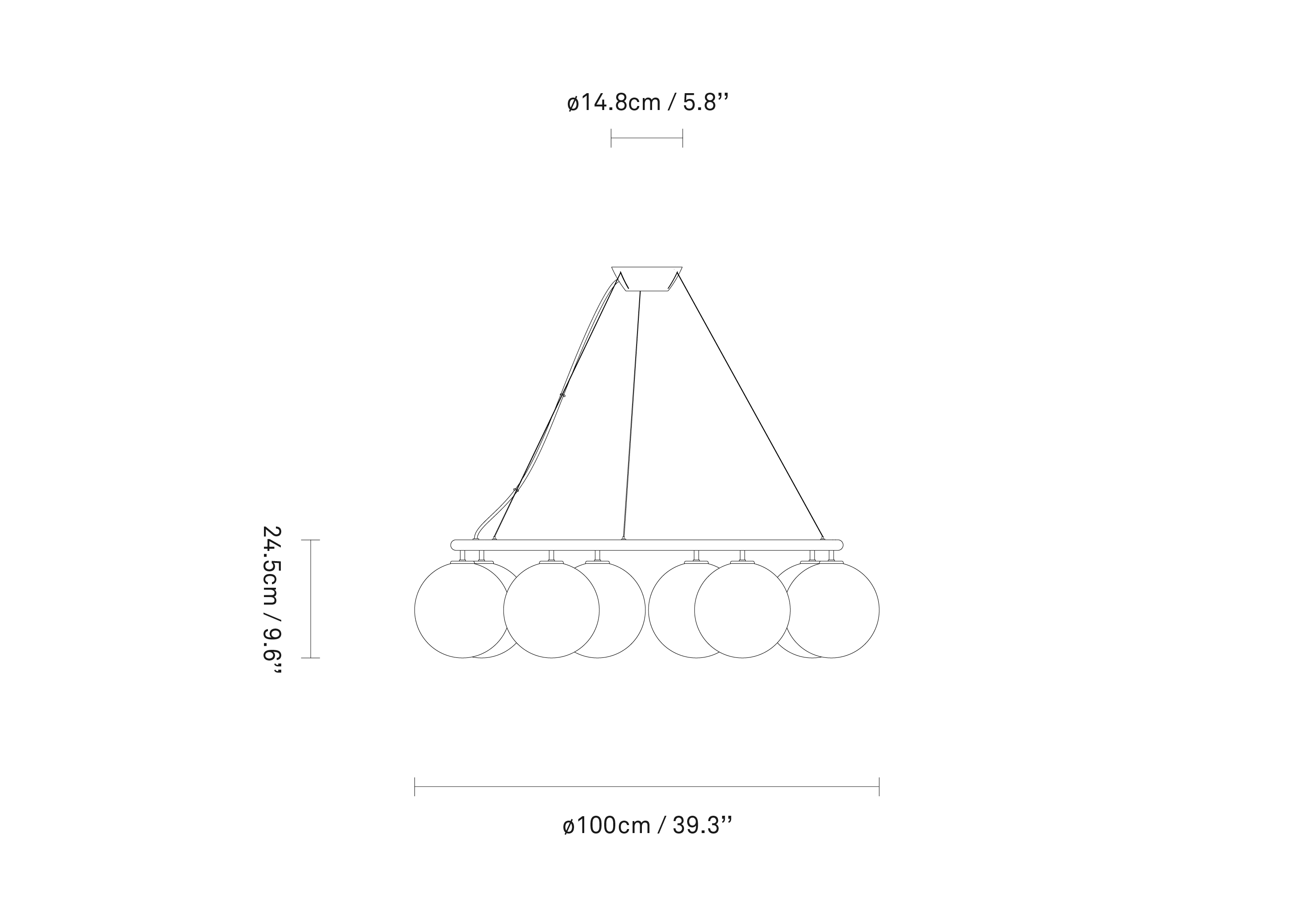 Miira 8 Circular has a plump and balanced expression, and the clean design is complemented by an industrial look from the dark bronze metal. With a special wire system between the ceiling plate and the metal ring, it is possible to set the Miira 8 Circular to the ideal height.