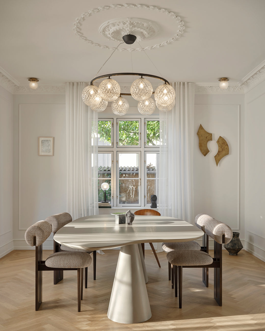 Miira 8 Circular chandelier features a round metal ring in rock grey finish holding 8 large mouth-blown glass globes in optic clear glass. The chandelier offers a sensuous light, and the special wire-system makes it easy to adjust how high or low to hang the lamp from the ceiling.