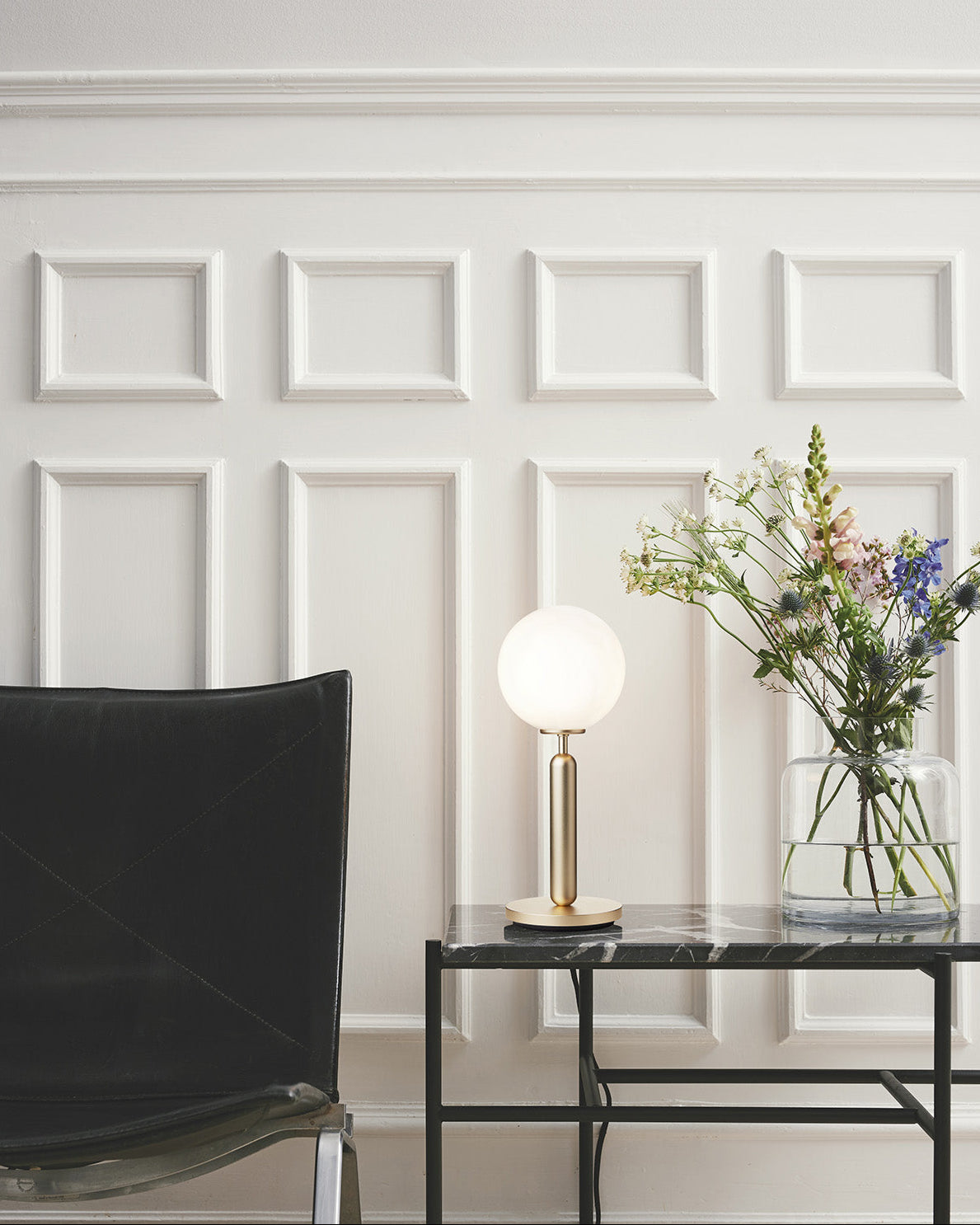 Simple and minimalistic table lamp in brass metal and opal white glass combination. The Miira Table lamp is set on a solid, round foot and topped with a neatly mouth-blown glass shade, providing a sense of symmetry. Cable with on/off switch.