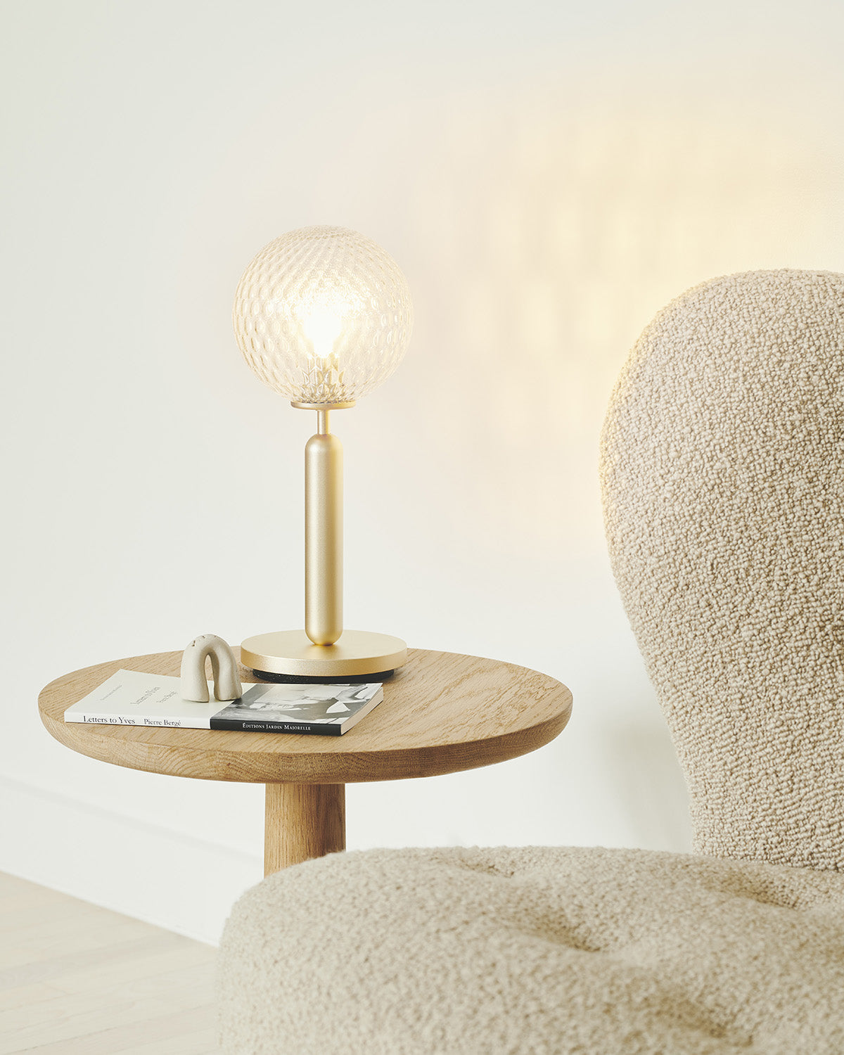Simple and minimalistic table lamp in brass coloured metal and optic clear glass. The contours in the mouth-blown patterned glass globe create a radiant light. Cable with on/off switch.