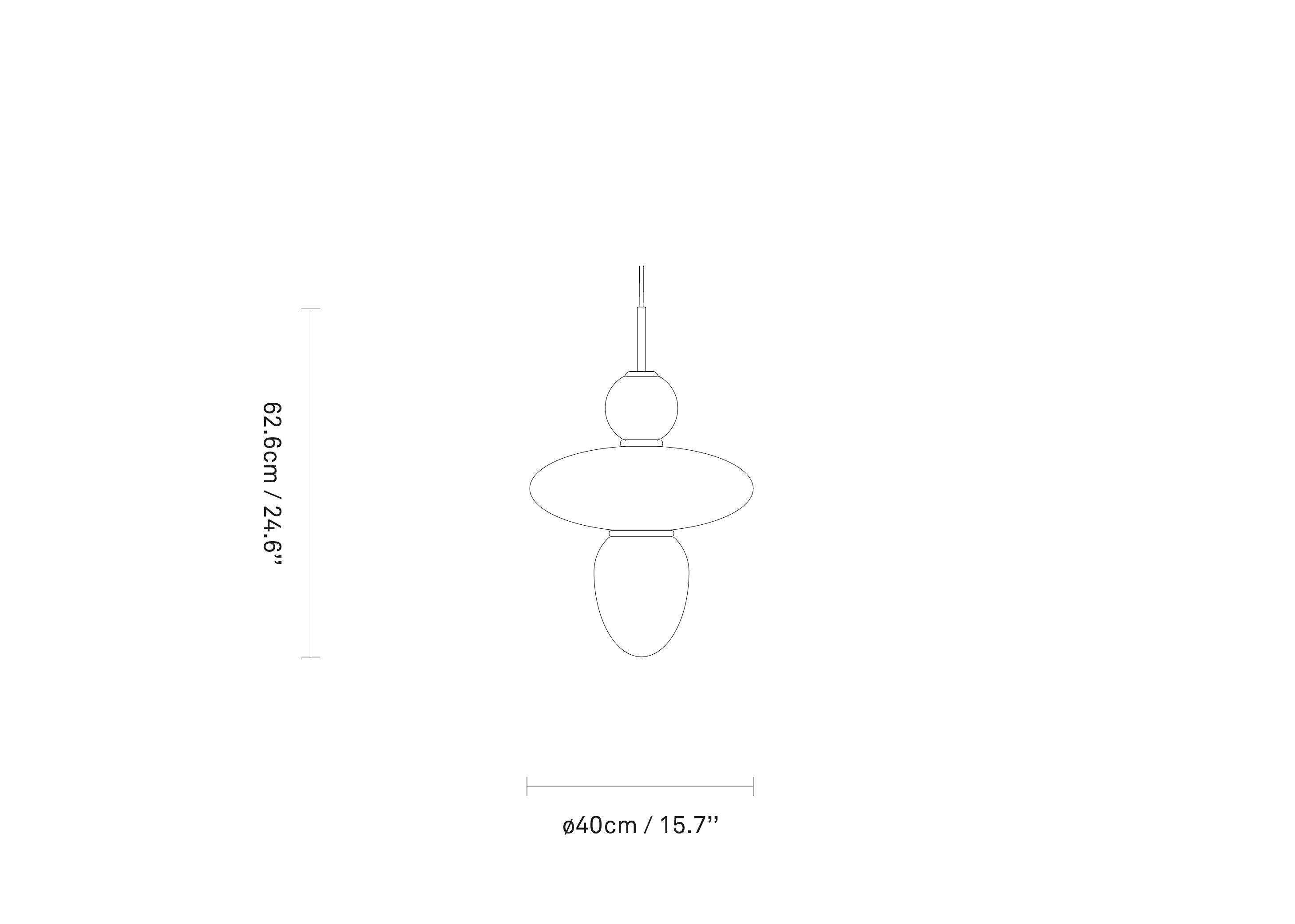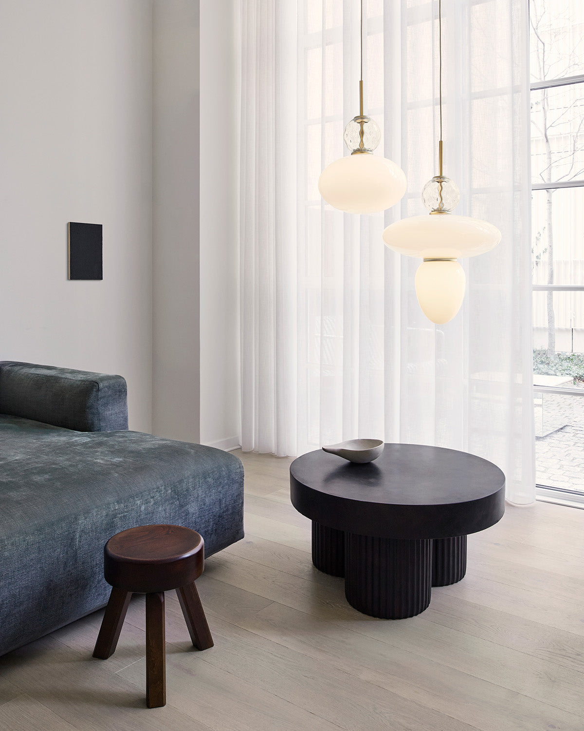Rizzatto 43 pendant features a sculptural design with a distinctive silhouette. The pendant includes a mouth-blown glass shade with a satin brass suspension, creating a harmonious balance of softness and sophistication. The satin brass finish adds a touch of warmth and understated luxury.