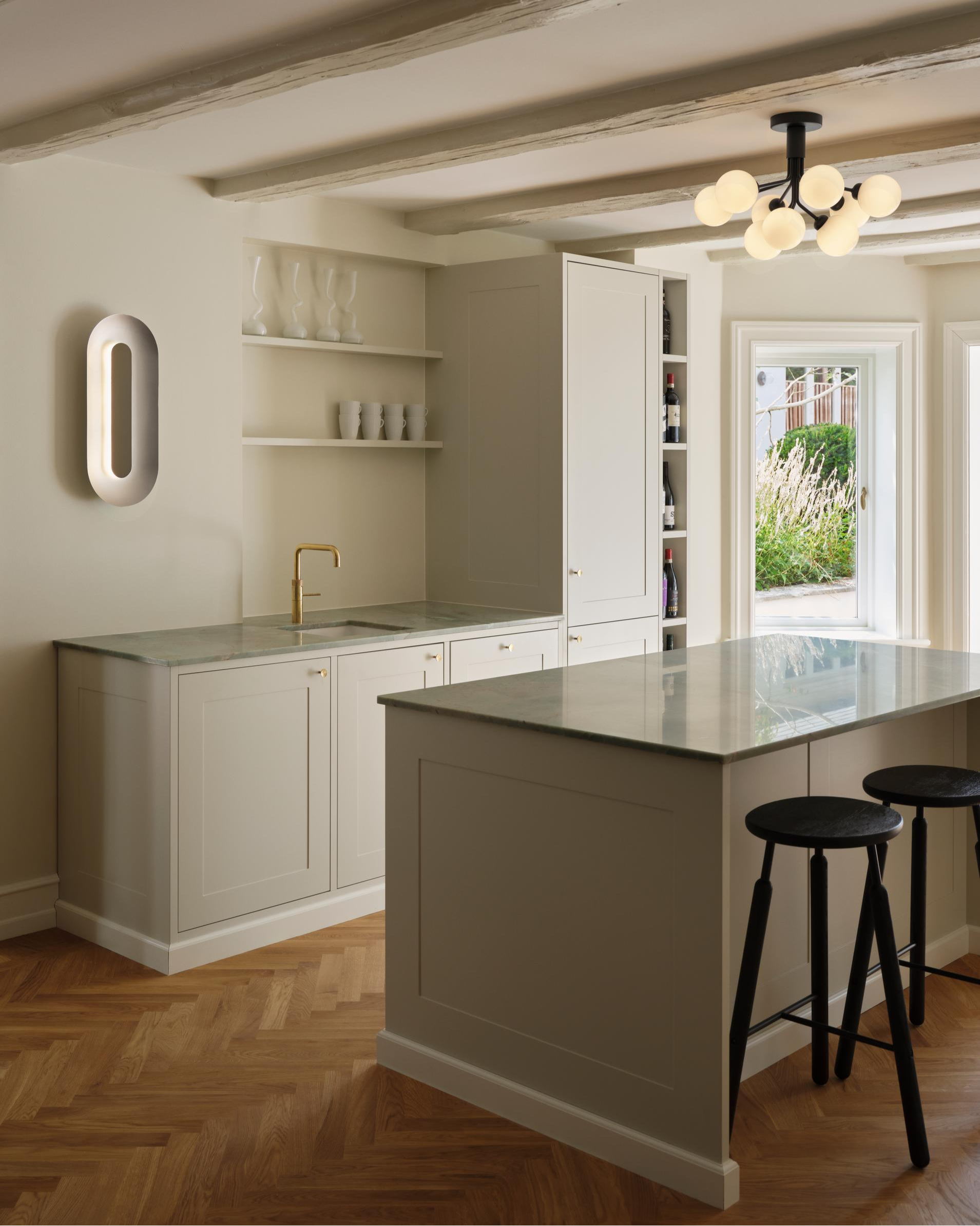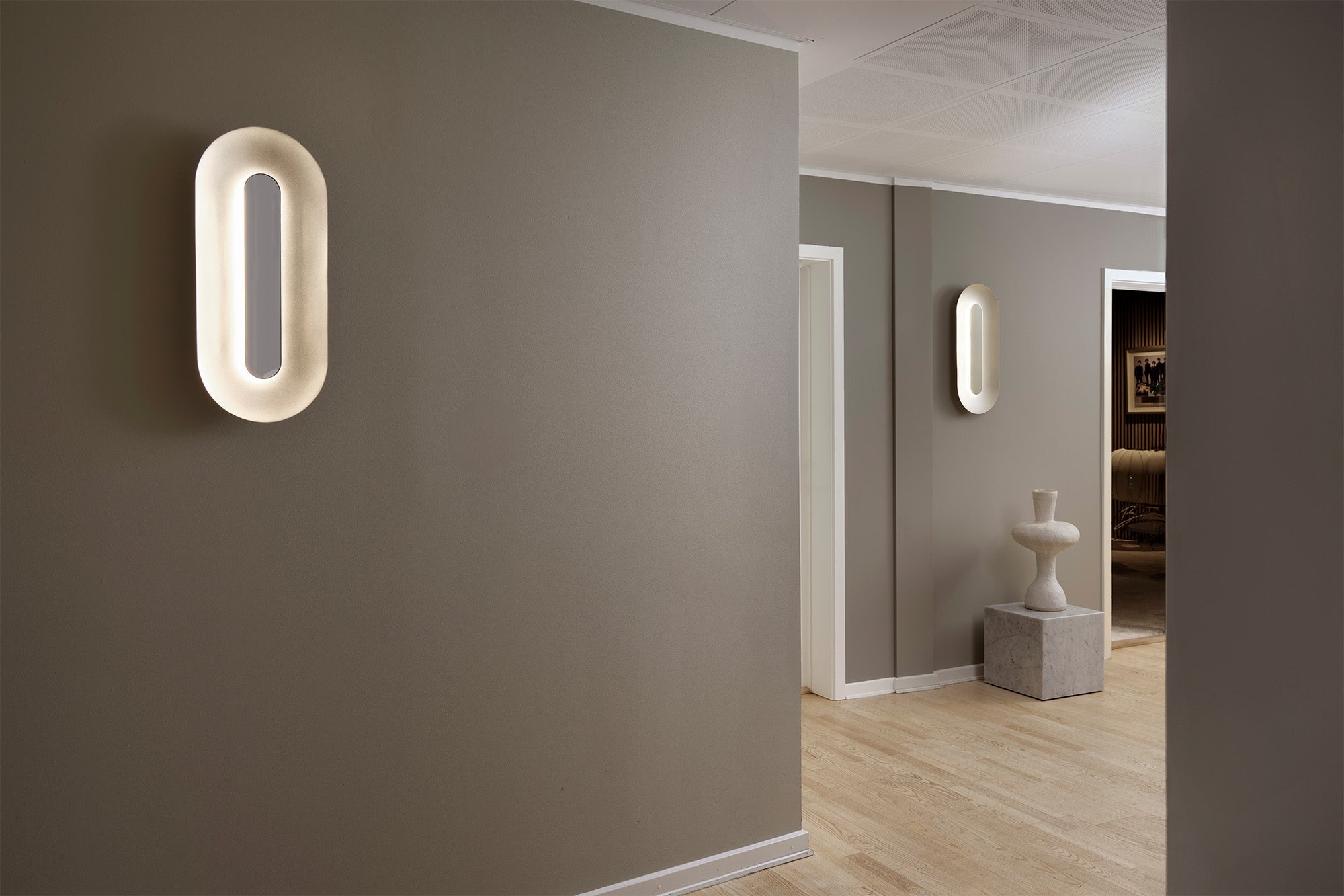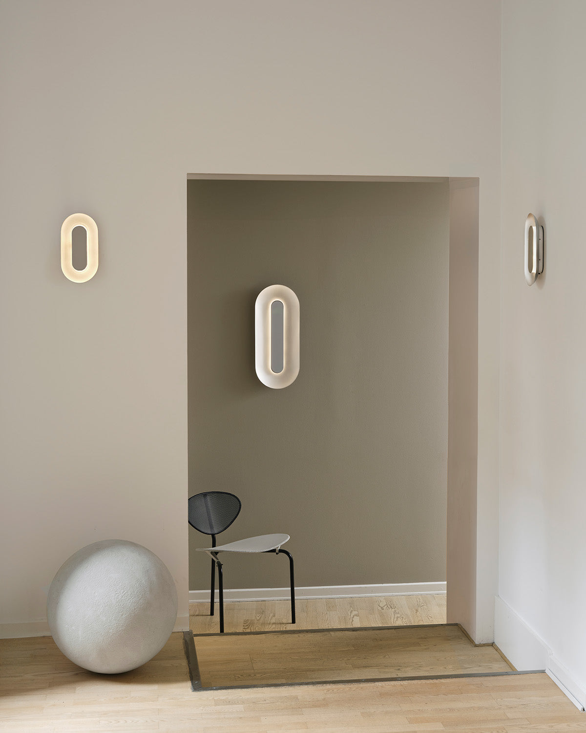 Sasi small is a decorative wall lamp, designed with a soft expression, a harmonious colour palette and carefully selected materials. The lamp consists of an oval aluminium frame in a satin silver finish, and a smaller shape with mirror effect. The polished shade conceals the integrated LED module, and a decorative light is spread and reflected in the frame.
